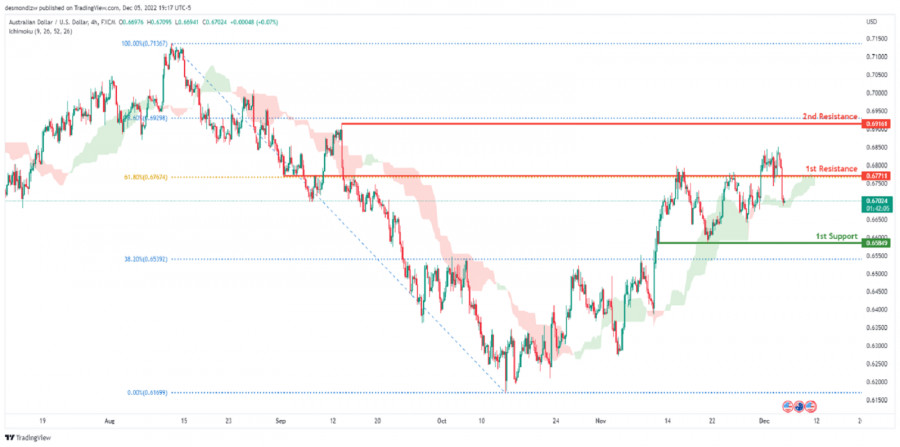 AUD/USD: ожидается усиление медвежьего импульса. Прогноз на 6 декабря 2022ИнстаФорекс - Instaforex, 2 года назад На 4-часовом графике пара AUD/USD торгуется в медвежьем тренде. В данный момент цена пересекает облако Ишимоку, что указывает на нисходящий импульс. Если медвежий импульс сохранится, ожидается, что цена направится к 1-му уровню поддержки 0.65849, соответствующему уровню коррекции Фибоначчи 38.2% и предыдущему уровню свинг-лоу. В альтернативном сценарии цена может развернуться вверх и повторно протестировать 1-й уровень сопротивления 0.67711, где расположен уровень коррекции Фибоначчи 61.8%. Торговая рекомендация Вход: 0.67711 Условия для входа: повторное тестирование 1-го уровня сопротивления Тейк-профит: 0.65849 Условия для фиксации прибыли: 1-й уровень поддержки и предыдущий уровень свинг-лоу Стоп-лосс: 0.68508 Условия для активации ордера стоп-лосс: область, где находится последний уровень свинг-хай Материал предоставлен компанией InstaForex - www.instaforex.com |