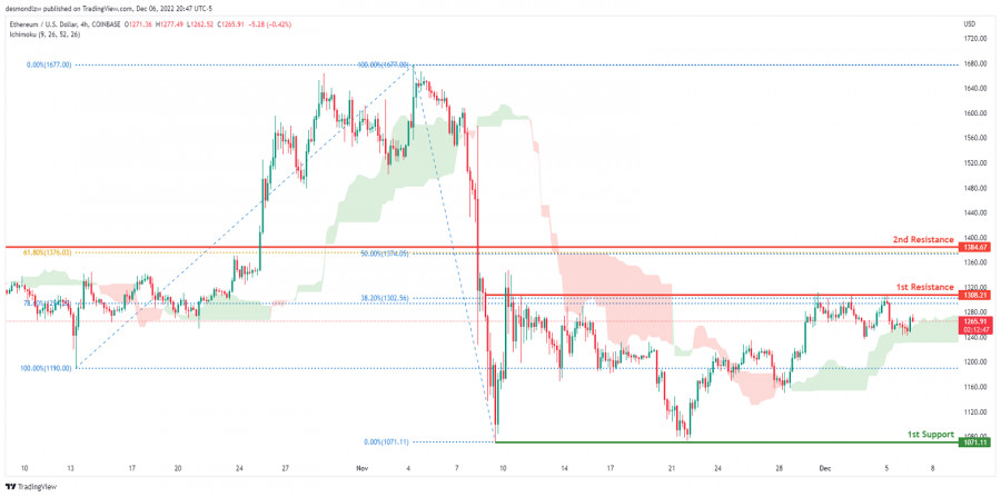 ETH/USD: ожидается формирование краткосрочного бычьего импульса. Прогноз на 7 декабря 2022ИнстаФорекс - Instaforex, 2 года назад На 4-часовом графике пара ETH/USD торгуется в медвежьем тренде. Однако сейчас цена находится выше облака Ишимоку, что может указывать на формирование краткосрочного бычьего импульса. Ожидается, что цена пробьет 1-й уровень сопротивления 1308.21, соответствующий уровням коррекции Фибоначчи 38.2% и 78.6%, и затем направится к 2-му уровню сопротивления 1384.67, где расположены уровни коррекции Фибоначчи 50% и 61.8%. В альтернативном сценарии цена может вернуться к 1-му уровню поддержки 1071.11, соответствующему предыдущему уровню свинг-лоу. Торговая рекомендация Вход: 1308.21 Условия для входа: 1-й уровень сопротивления Тейк-профит: 1071.11 Условия для фиксации прибыли: 1-й уровень поддержки Стоп-лосс: 1677.00 Условия для активации ордера стоп-лосс: чуть выше области, где расположен 2-й уровень сопротивления Материал предоставлен компанией InstaForex - www.instaforex.com |