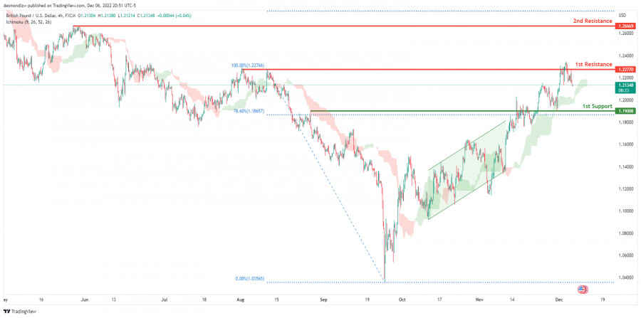 GBP/USD развивает бычий импульс. Прогноз на 7 декабря 2022ИнстаФорекс - Instaforex, 2 года назад На 4-часовом графике пара GBP/USD торгуется в бычьем тренде. В настоящее время цена находится выше облака Ишимоку, что указывает на восходящий импульс. Ожидается, что цена укрепится и протестирует 1-й уровень сопротивления 1.22770, где расположен предыдущий хай. В альтернативном сценарии цена может развернуться вниз и направиться к 1-му уровню поддержки 1.19008, соответствующему уровню коррекции Фибоначчи 78.6%. Торговая рекомендация Вход: 1.22770 Условия для входа: 1-й уровень сопротивления Тейк-профит: 1.19008 Условия для фиксации прибыли: 1-й уровень поддержки Стоп-лосс: 1.26669 Условия для активации ордера стоп-лосс: 2-й уровень сопротивления Материал предоставлен компанией InstaForex - www.instaforex.com |
