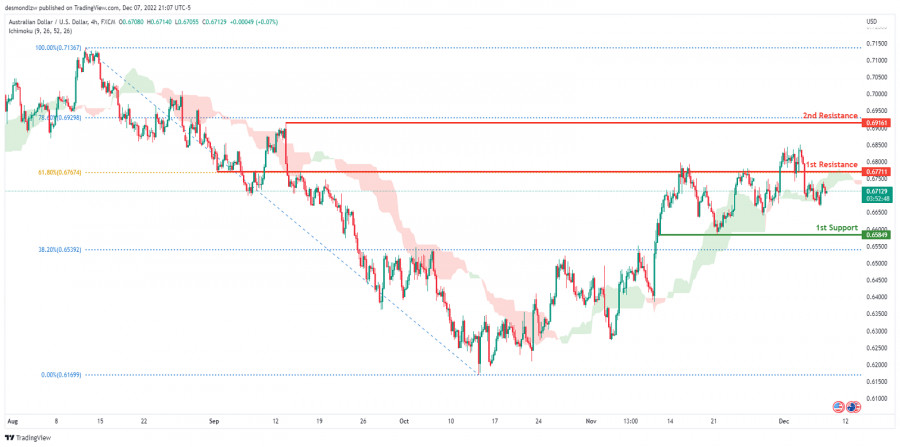 AUD/USD: ожидается формирование медвежьего импульса. Прогноз на 8 декабря 2022ИнстаФорекс - Instaforex, 2 года назад На 4-часовом графике пара AUD/USD торгуется в медвежьем тренде. В настоящее время цена пересекает облако Ишимоку, что указывает на нисходящий импульс. Если медвежий импульс сохранится, ожидается, что цена направится к 1-му уровню поддержки 0.65849, где расположен уровень коррекции Фибоначчи 38.2% и предыдущий уровень свинг-лоу. В альтернативном сценарии цена может развернуться вверх, чтобы повторно протестировать 1-й уровень сопротивления 0.67711, соответствующий уровню коррекции Фибоначчи 61.8%. Торговая рекомендация Вход: 0.67711 Условия для входа: повторное тестирование 1-го уровня сопротивления Тейк-профит: 0.65849 Условия для фиксации прибыли: 1-й уровень поддержки и предыдущий уровень свинг-лоу Стоп-лосс: 0.68508 Условия для активации ордера стоп-лосс: область, где расположен последний уровень свинг-хай Материал предоставлен компанией InstaForex - www.instaforex.com |