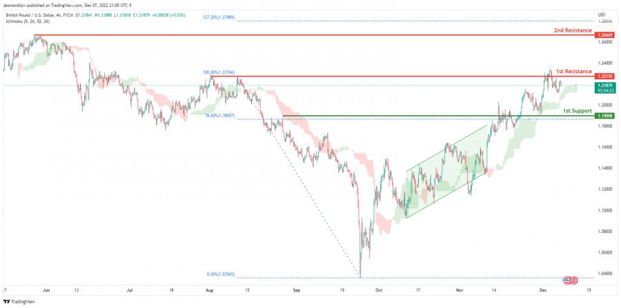 GBP/USD развивает бычий импульс. Прогноз на 8 декабря 2022ИнстаФорекс - Instaforex, 2 года назад На 4-часовом графике пара GBP/USD торгуется в бычьем тренде. В настоящее время цена находится выше облака Ишимоку, что указывает на восходящий импульс. Ожидается, что цена повторно протестирует 1-й уровень сопротивления 1.22770, где расположен предыдущий хай. В альтернативном сценарии цена может вернуться к 1-му уровню поддержки 1.19008, соответствующему уровню коррекции Фибоначчи 78.6%. Торговая рекомендация Вход: 1.22770 Условия для входа: 1-й уровень сопротивления Тейк-профит: 1.19008 Условия для фиксации прибыли: 1-й уровень поддержки Стоп-лосс: 1.26669 Условия для активации ордера стоп-лосс: 2-й уровень сопротивления Материал предоставлен компанией InstaForex - www.instaforex.com |