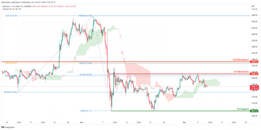 ETH/USD торгуется с медвежьим уклоном. Прогноз на 8 декабря 2022 г.ИнстаФорекс - Instaforex, 2 года назад На 4-часовом графике пара ETH/USD торгуется в медвежьем тренде. В настоящее время цена находится ниже облака Ишимоку, что указывает на нисходящий импульс. Ожидается, что цена вернется к 1-му уровню поддержки 1071.11, где расположен предыдущий уровень свинг-лоу. В альтернативном сценарии цена может пробить 1-й уровень сопротивления 1308.21, соответствующий уровню коррекции Фибоначчи 38.2% и 78.6%, и затем направиться ко 2-му уровню сопротивления 1384.67, где расположены уровни коррекции Фибоначчи 50% и 61.8%. Торговая рекомендация Вход: 1308.21 Условия для входа: 1-й уровень сопротивления Тейк-профит: 1071.11 Условия для фиксации прибыли: 1-й уровень поддержки Стоп-лосс: 1677.00 Условия для активации ордера стоп-лосс: чуть выше области, где расположен 2-й уровень сопротивления Материал предоставлен компанией InstaForex - www.instaforex.com |
