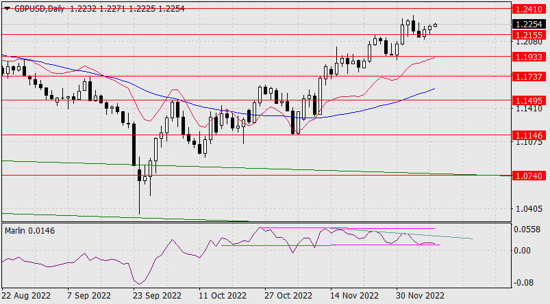 Прогноз по GBP/USD на 9 декабря 2022 годаИнстаФорекс - Instaforex, 2 года назад Фунт стерлингов так и не закрепился под уровнем 1.2200. Вероятно, данный уровень определён не совсем корректно, поэтому он модифицирован, перенесён чуть ниже, на цену 1.2155 – на минимум 13 мая, также отработанный и 24 ноября как сопротивление. Теперь мы видим, что снижение цены под 1.2155 6-го декабря было ложным. При росте цены к сопротивлению 1.2410 вполне может быть тройная дивергенция с осциллятором Марлин (бирюзовая линия в окне осциллятора). Если цена соберётся с силами и вдруг уйдёт под 1.2155, то сигнальная линия Марлина преодолеет поддержку нижней границы диапазона и подключится к развитию среднесрочного понижения. Ждём развития событий.