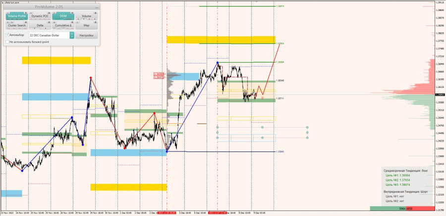 Среднесрочная тенденция: в лонг. Максимальное скопление объемов среднесрочной тенденции расположено в диапазоне по котировкам 1.36471-1.36584. В настоящий момент по паре совершаются инвестиционные операции ниже, указывая на слабость покупателей.