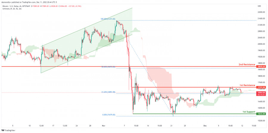 BTC/USD торгуется под контролем медведей. Прогноз на 12 декабря 2022ИнстаФорекс - Instaforex, 2 года назад На 4-часовом графике пара BTC/USD торгуется в медвежьем тренде. В настоящее время цена пересекает облако Ишимоку, что указывает на нисходящий импульс. Ожидается, что цена вернется к 1-му уровню поддержки 15632.00, где расположен предыдущий уровень свинг-лоу. В альтернативном сценарии цена может пробить 1-й уровень сопротивления 17297.00, соответствующий уровню коррекции Фибоначчи 23.6%, и затем направиться ко 2-му уровню сопротивления 18173.33, где расположен предыдущий уровень свинг-лоу и 50% уровень коррекции Фибоначчи. Торговая рекомендация Вход: 17297.00 Условия для входа: 1-й уровень сопротивления Тейк-профит: 18595.60 Условия для фиксации прибыли: 2-й уровень сопротивления Стоп-лосс: 16000 Условия для активации ордера стоп-лосс: предыдущий уровень свинг-лоу Материал предоставлен компанией InstaForex - www.instaforex.com |