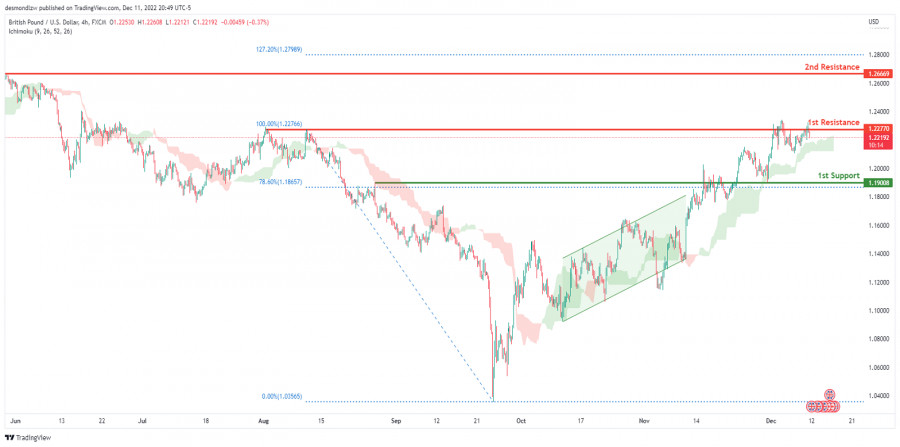 GBP/USD: ожидается формирование бычьего импульса. Прогноз на 12 декабря 2022ИнстаФорекс - Instaforex, 2 года назад На 4-часовом графике пара GBP/USD торгуется в бычьем тренде. В настоящее время цена находится выше облака Ишимоку, что указывает на восходящий импульс. Ожидается, что цена укрепится, чтобы пробить 1-й уровень сопротивления 1.22770, соответствующий предыдущему максимуму, и затем направится ко 2-му уровню сопротивления 1.26669, где расположен предыдущий уровень свинг-хай. В альтернативном сценарии цена может вернуться к 1-му уровню поддержки 1.19008, соответствующему уровню коррекции Фибоначчи 78.6%. Торговая рекомендация Вход: 1.23442 Условия для входа: вход по бай-стоп выше недавних максимумов Тейк-профит: 1.26669 Условия для фиксации прибыли: 2-й уровень сопротивления Стоп-лосс: 1.21062 Условия для активации ордера стоп-лосс: предыдущий уровень свинг-лоу Материал предоставлен компанией InstaForex - www.instaforex.com |