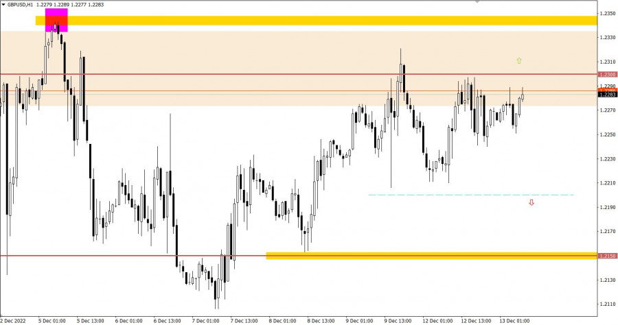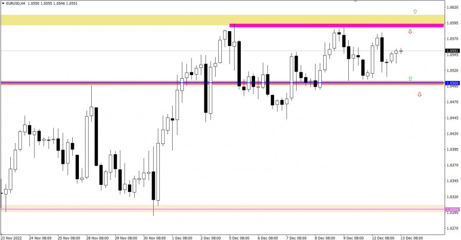 Цены производителей в Соединенных Штатах замедлили темп роста с 6,8% до 5,9%, что означает дальнейшее снижение инфляции. Этот факт в очередной раз доказывает высокие шансы замедления темпа повышения процентной ставки ФРС. Разбор торговых графиков от 12 декабряЕвро по отношению к доллару США движется в рамках боковой амплитуды 1.0500/1.0600, где верхняя граница немного скорректирована, примерно на 15 пунктов. Последовательный отскок цены сигнализирует о процессе накопления торговых сил, что в итоге может привести к исходящему импульсу. Валютная пара GBPUSD движется в рамках двух значений 1.2200/1.2300, проявляя на рынке среднюю активность. Фактически это колебание указывает на характерный застой, который в итоге может стать рычагом для новых спекулятивных скачков цены. Экономический календарь на 13 декабряС открытия европейской сессии были опубликованы данные по рынку труда в Великобритании, где уровень безработицы вырос с 3,6% до 3,7%. Однако занятость в стране выросла в период октября на 27 тыс. вместо прогноза снижения на 17 тыс. В общем плане показатели по рынку труда оказались не столь плохими, как ожидании ранее. Фунт стерлингов перешел к укреплению. В период американской торговой сессии внимание трейдеров будет сосредоточено на данных по инфляции в Соединенных Штатах, которые могут отразить ее замедление с 7,7% до 7,6%. Учитывая тот факт, что на следующий день станут известны итоги заседания ФРС, снижение уровня инфляции служит хорошим экономическим индикатором относительно возможных действий со стороны регулятора. Снижение уровня инфляции может привести к распродаже доллара США. Временной таргетинг Инфляция в США – 16:30 по МСК