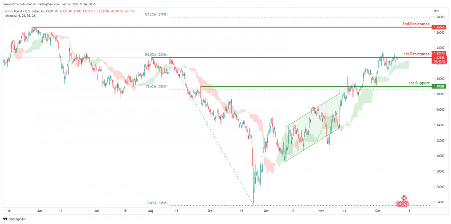 GBP/USD: ожидается усиление бычьего импульса. Прогноз на 13 декабря 2022ИнстаФорекс - Instaforex, 2 года назад На 4-часовом графике пара GBP/USD торгуется в бычьем тренде. В настоящее время цена находится выше облака Ишимоку, что указывает на восходящий импульс. Ожидается, что цена направится вверх, чтобы пробить 1-й уровень сопротивления 1.22770, соответствующий предыдущему максимуму, прежде чем направиться ко 2-му уровню сопротивления 1.26669, где расположен предыдущий уровень свинг-хай. В альтернативном сценарии цена может вернуться к 1-му уровню поддержки 1.19008, где расположен уровень коррекции Фибоначчи 78.6%. Торговая рекомендация Вход: 1.23442 Условия для входа: вход по бай-стоп выше предыдущих недавних максимумов Тейк-профит: 1.26669 Условия для фиксации прибыли: 2-й уровень сопротивления Стоп-лосс: 1.21062 Условия для активации ордера стоп-лосс: предыдущий уровень свинг-лоу Материал предоставлен компанией InstaForex - www.instaforex.com |