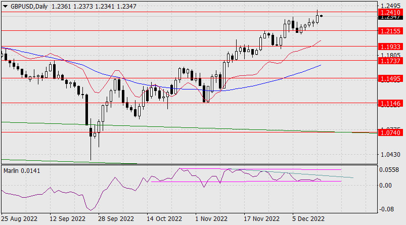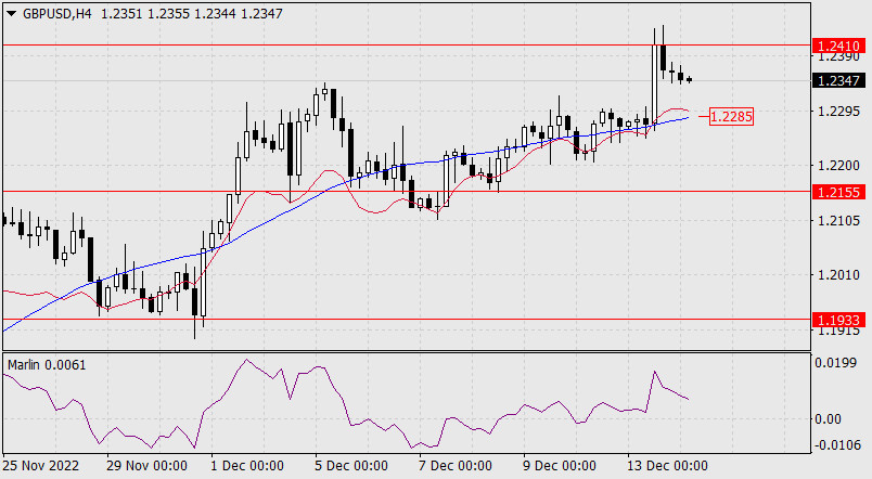 Прогноз по GBP/USD на 14 декабря 2022 годаИнстаФорекс - Instaforex, 2 года назад Британский фунт вчера подрос на 93 пункта, достигнув целевой уровень 1.2410. Тройная дивергенция с осциллятором Марлин по бирюзовой линии на дневном графике так и не сформировалась. Но у дивергенции не всё потеряно. Если по сегодняшнему заседанию ФРС цена достигнет целевой диапазон 1.2598-1.2666, то тройная дивергенция может сформироваться. И тогда цена развернётся в обратное направление, к целям 1.2410 и 1.2155.
