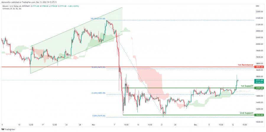 BTC/USD развивает бычий импульс. Прогноз на 14 декабря 2022ИнстаФорекс - Instaforex, 2 года назад На 4-часовом графике пара BTC/USD торгуется в бычьем тренде. В настоящее время цена находится выше облака Ишимоку, что указывает на восходящий импульс. Ожидается, что цена направится к 1-му уровню сопротивления 18173.33, соответствующему предыдущему уровню свинг-лоу и 50% уровню коррекции Фибоначчи. В альтернативном сценарии цена может вернуться к 1-му уровню поддержки 17297.00, где расположен уровень коррекции Фибоначчи 23.6%. Торговая рекомендация Вход: 17297.00 Условия для входа: повторное тестирование 1-го уровня поддержки Тейк-профит: 18595.60 Условия для фиксации прибыли: 1-й уровень сопротивления Стоп-лосс: 16891 Условия для активации ордера стоп-лосс: предыдущий уровень свинг-лоу Материал предоставлен компанией InstaForex - www.instaforex.com |