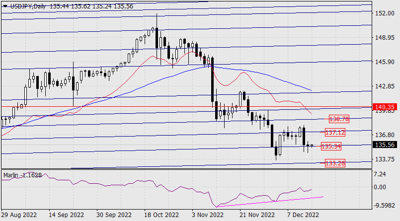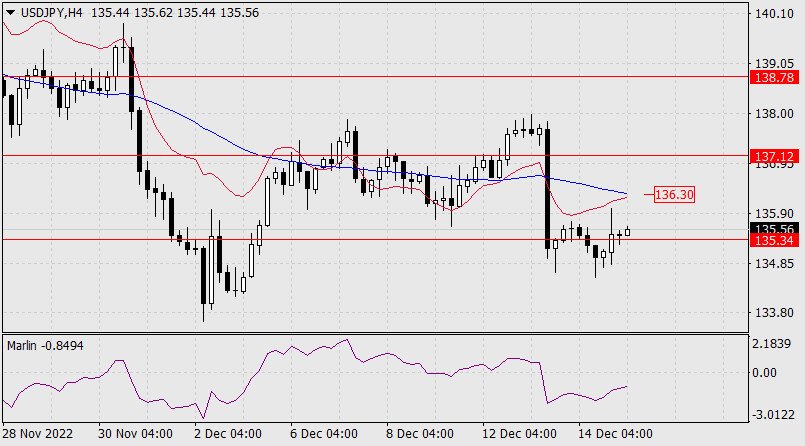 Прогноз по USD/JPY на 15 декабря 2022 годаИнстаФорекс - Instaforex, 3 года назад После снижения пары USD/JPY к поддержке 135.34 во вторник, до сегодняшнего утра цена продолжает удерживаться на этой линии ценового канала. Осциллятор Марлин растёт, у цены есть возможность подрасти до 137.12. Преодоление уровня откроет цель 138.78. закрепление под 135.34 откроет цель 133.26.