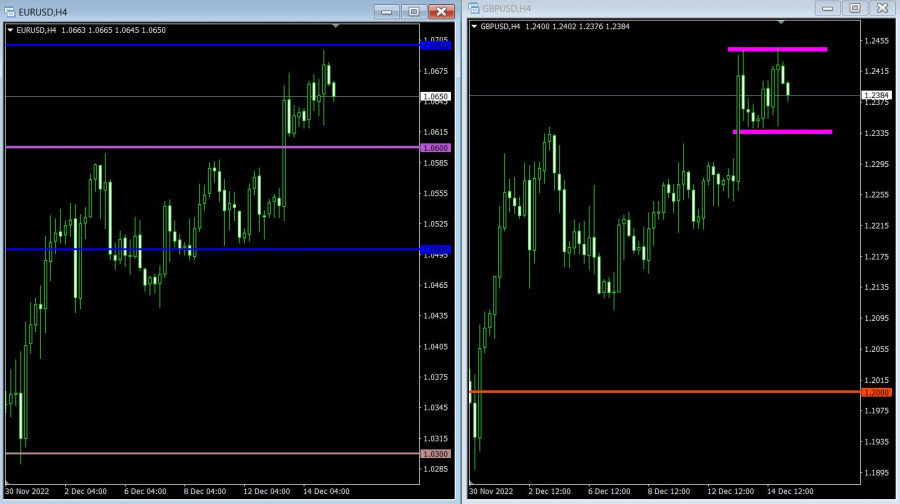 Торговый план по EUR/USD и GBP/USD на 15.12.2022ИнстаФорекс - Instaforex, 2 года назад Само по себе повышение ставки рефинансирования Федеральной Резервной Системы на пятьдесят базисных пунктов не стало какой-то там неожиданностью. Рынки в общем-то давно были к этому готовы. Но судя по поведению единой европейской валюты с фунтом, такое чувство, словно само заседание оказалось каким-то будничным и проходным. Хотя это далеко не так. Американский регулятор внезапно пересмотрел свой сентябрьский экономический прогноз. Хотя предполагалось, что о пересмотре своих прогнозов и планов Федеральная Резервная Система объявит лишь в начале будущего года. Причем изменения оказались довольно существенными. В частности, в отношении уровня процентных ставок. В сентябрьском прогнозе средний уровень процентных ставок в будущем году предполагался на уровне 4,6%. То есть, к концу года ставка рефинансирования должна находиться в диапазоне от 4,50% до 4,75%. Теперь же уровень процентных ставок был повышен до 5,1%. Иными словами, к концу 2023 года ставка рефинансирования должна находиться где-то от 5,00% до 5,25%. А значит, никакого снижения ставки рефинансирования в будущем году ждать не стоит. Тогда как еще до заседания большинство участников рынка исходило из того, что цикл повышений процентных ставок завершится в середине будущего года, а осенью уже начнется цикл их снижения. Кроме того, несколько повышен средний уровень процентных ставок как в 2024-м, так и в 2025 году. Не так сильно, как на 2023 года, но все же повышен. Ставка рефинансирования (Соединенные Штаты): В этой связи возникает простой вопрос - почему мы не увидели серьезного укрепления доллара? Хотя, по логике вещей, должен был начаться довольно продолжительный и устойчивый тренд на укрепление американской валюты. А все дело в том, что рынок ждет ответа со стороны Европейского Центрального Банка и в некоторой степени еще от Банка Англии, чье заседания как раз сегодня и состоятся. Первым пройдет как раз заседание Банка Англии, и нет никаких сомнений, что ставка рефинансирования будет повышена с 3,0% до 3,5%. Рынок давно уже готов к подобному развитию событий. Ставка рефинансирования (Великобритания): Примерно то же самое и в случае с Европейским Центральным Банком, итоги заседания которого станут известны всего через час с небольшим после заседания британского регулятора. С той лишь разницей, что ставка рефинансирования видимо будет повышена с 2,0% до 2,5%. То есть, итоги аналогичные, с поправкой на несколько более низкий уровень процентных ставок. Ставка рефинансирования (Европа): Сами повышения никакого эффекта не возымеют. В свете пересмотра планов Федеральной Резервной Системы интерес вызывают лишь последующие заявления. Причем следить будут за заявлениями именно Кристин Лагард. Все дело в том, что в конце сентября на рынке произошла заметная переоценка ожиданий, так как у инвесторов появилась уверенность в том, что уже в следующем году уровень процентных ставок в Европе будет выше, нежели в Соединенных Штатах. Именно по этой причине доллар и теряет свои позиции вот уже два с лишним месяца. Однако пересмотр прогноза Федеральной Резервной Системы несколько меняет ситуацию. Если Европейский Центральный Банк прямо сегодня не сделает аналогичных заявлений, то сразу же начнется возврат к значениям конца сентября. То есть к 