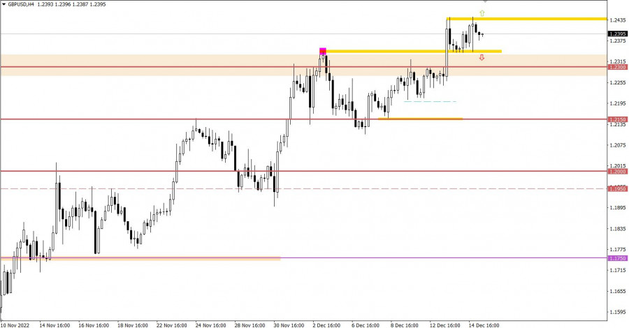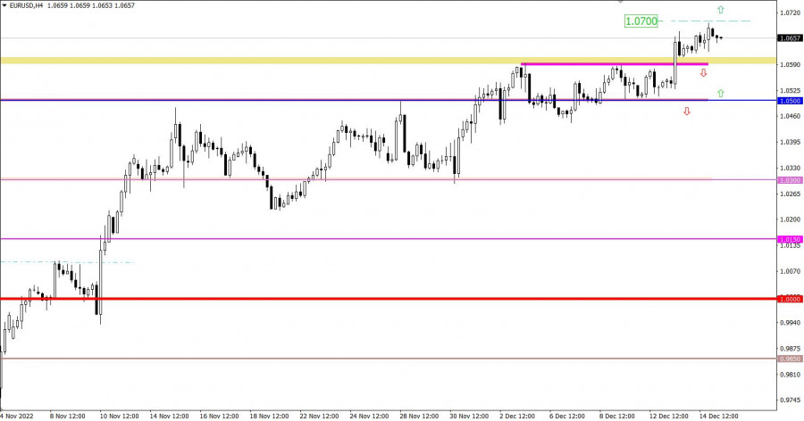 Данные по инфляции в Великобритании отразили замедление темпа роста с 11,1% до 10,7% при прогнозе 10,9%. Несмотря на то что данные положительные, инфляция все еще находится на очень высоком уровне. Реакция рынка, в частности фунта стерлингов, имела нейтральный характер на статистические данные. Самым важным экономическим событием не только минувшего дня, но и всего декабря считаются итоги ФРС, где регулятор ожидаемо повысил ставку рефинансирования на 50 базисных пунктов. Это первое замедление темпа повышения ставки с начала цикла ужесточения. В теории этот факт должен был стать рычагом для роста финансовых рынков, однако мы увидели обратную реакцию. В чем причина разочарования? Первое – факт замедления темпов повышения ставок был известен рынку еще осенью. Второе – регулятор изменил прогнозы касательно дальнейшего повышения ставок. К концу 2023 г. ставка может составить 5,1%, предыдущий прогноз был 4,6%. Кроме того, повышен прогноз среднего уровня ставок на 2024 и 2025 годы. В итоге рынок разочаровался в итогах декабрьского заседания FOMC, фондовый рынок США пошел вниз. Реакция рынков в моменте: - NASDAQ100 -2,5% - S&P500 -2,0% - BTCUSD -2,5% Разбор торговых графиков от 14 декабряЕвро по отношению к доллару США вплотную подошел к значению 1.0700, относительно которого возник незначительный по масштабу откат. Фактически покупатели продолжили наращивать объем длинных позиций, что привело к пролонгации действующего восходящего цикла. Валютная пара GBPUSD минувший день провела на пике восходящего цикла, проявив локальный интерес к длинным позициям. Кардинальных перемен не наблюдается на рынке, лишь удержание цены в действующем цикле. Экономический календарь на 15 декабряСегодня нас ожидает сразу два заседания Центробанков, это ЕЦБ и Банк Англии, где, исходя из прогнозов, ожидают повышение процентных ставок на 50 базисных пунктов. В данном случае особое внимание будет уделено комментарием ЕЦБ и последующей пресс-конференции, т.к. инвесторы могут получить от регулятора намеки касательно последующего смягчение политики ЕЦБ. В случае появление таких намеков могут возникнуть соответствующие спекуляции на рынке. Временной таргетинг Итоги заседания Банка Англии – 15:00 по МСК Итоги заседания ЕЦБ – 16:15 по МСК Пресс-конференция ЕЦБ – 16:45 по МСК