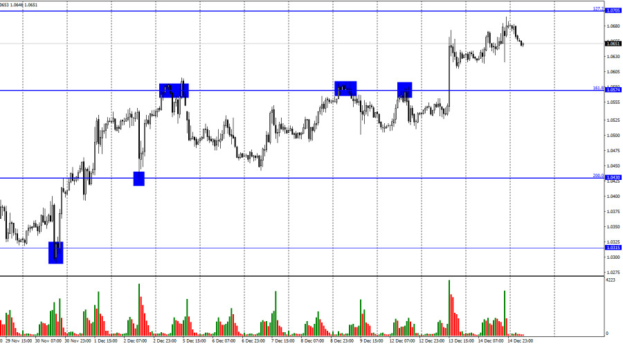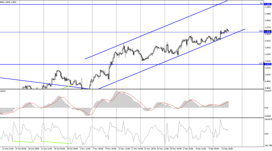 EUR/USD. 15 декабря. Заседание ФРС: а был ли мальчик?ИнстаФорекс - Instaforex, 2 года назад На 4-часовом графике пара продолжает процесс роста в направлении коррекционного уровня 100,0% - 1,0638. Отбой котировок от этого уровня сработает в пользу американской валюты и некоторого падения в направлении уровня Фибо 127,2% - 1,0173. Закрепление курса пары над уровнем 1,0638 повысит шансы на дальнейший рост в направлении уровня 1,1041. Восходящий трендовый коридор сейчас характеризует настроение трейдеров, как «бычье». Закрытие котировок под ним сработает в пользу доллара США и начала сильного падения.