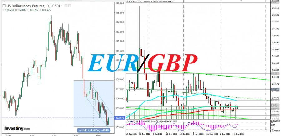 EUR/GBP: итоги заседания ФРС и накануне заседаний ЕЦБ и Банка АнглииИнстаФорекс - Instaforex, 2 года назад После того как в среду ФРС ожидаемо повысила свою процентную ставку на 0,50%, сегодня еще один крупнейший мировой центральный банк, НБ Швейцарии, также повысил свою ключевую процентную ставку (по депозитам) на 0,50%, что также совпало с ожиданиями рынка. Это было третье подряд повышение процентной ставки НБШ в этом году. Сразу после публикации данного решения франк в основном укрепился на рынке, но снизился против доллара. Впрочем, доллар сегодня фаворит на рынке, по крайней мере в первой половине сегодняшнего торгового дня. Причиной этому стало вчерашнее решение ФРС и сопутствующие заявления ее руководителей. Если повышение процентной ставки на 0,50% было ожидаемо рынком, то заявления главы ФРС Пауэлла, сделанные им в ходе последовавшей затем пресс-конференции, придали уверенности покупателям доллара. На момент публикации данной статьи его индекс DXY тестирует на пробой локальный круглый уровень сопротивления 104.00, оттолкнувшись от вчерашнего локального (с июля) минимума 103.07. Как заявил вчера Пауэлл, "полученные данные по инфляции за октябрь и ноябрь действительно свидетельствуют о долгожданном снижении ценового давления, однако нужно значительно больше доказательств, чтобы быть уверенными в снижении инфляции". При этом наибольшую боль, по его мнению, принесет неспособность поднять ставки достаточно высоко. Насколько высоко поднять ставки, зависит, по словам Пауэлла, от прогресса в инфляции, финансовых условий и того, насколько ограничительными должны быть действия ФРС. "По мнению FOMC, нам нужно удерживать ставки на пиковом уровне до тех пор, пока мы не будем действительно уверены, что инфляция будет снижаться устойчивым образом", - также заявил он. Из других ключевых цитат Пауэлла следует, что "уровень безработицы 4,7% — это все еще сильный рынок труда", в ФРС "еще не достигли достаточно ограничительного уровня политики", и "предстоит пройти определенный путь повышения ставок". При этом "FOMC продолжает рассматривать риски для инфляции как повышательные". К резюме выступления Пауэлла можно отнести, что "для достижения достаточного уровня ужесточения необходимо продолжать повышение ставок". После этого заседания руководители ФРС пересмотрели свои прогнозы относительно пика процентной ставки. Теперь на конец 2023 года они предполагают повышение показателя до 5,1% вместо 4,6%, озвученных в сентябре. Общий вывод, который можно сделать по итогам декабрьского заседания ФРС, - процентная ставка в США будет повышаться и далее, как минимум до уровня 5,1% (к концу 2023 года), но многое также будет зависеть от текущей ситуации в экономике, на рынке труда и от динамики инфляции. Если она будет устойчиво снижаться и далее, то темпы повышения процентной ставки также будут замедляться. "Наши решения будут зависеть от поступающих данных в их совокупности", - сказал глава ФРС Джером Пауэлл. Таким образом, основания для укрепления доллара вчера были заложены. Однако как на самом деле поведет себя индекс доллара DXY - также будет зависеть от динамики основных конкурентов доллара на валютном рынке. И здесь на передний план выходят действия соответствующих центральных банков, эмитентов этих валют. Сегодня утром свое заседание провёл, как мы уже отметили в начале стати,