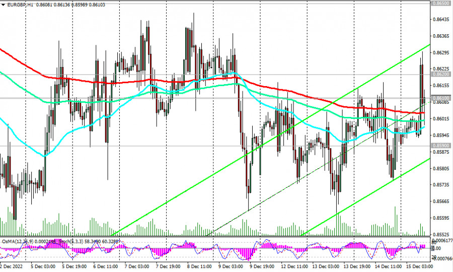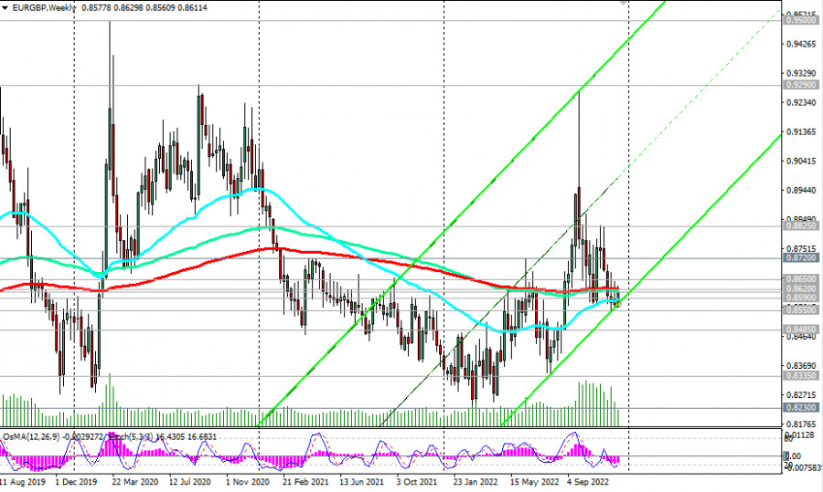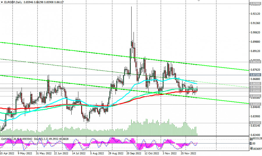 EUR/GBP: технический анализ и торговые рекомендации на 15.12.2022ИнстаФорекс - Instaforex, 2 года назад Сегодня для участников рынка, следящих за динамикой EUR/GBP, важнейший день: в 12:00 и 13:15 (GMT) свои решения по процентным ставкам опубликуют центральные банки Великобритании и Еврозоны. В нашем сегодняшнем «Фундаментальном анализе» мы уже отметили, что с начала месяца EUR/GBP остаётся зажатой в узком диапазоне между уровнями 0.8650 (ЕМА50 на дневном графике) и 0.8550 (локальный уровень поддержки) и в еще более узком – между ключевыми уровнями 0.8620 (ЕМА200 на недельном графике) и 0.8590 (ЕМА200 на дневном графике). Условная пружина зажата очень сильно. Ситуация требует разрядки, которая может вылиться в прорыв границ указных диапазонов и в сильное движение, в какую сторону – многое будет зависеть от итогов сегодняшних заседаний Банка Англии и ЕЦБ. Пробой верхней границы диапазона 0.8650 обусловит дальнейший рост пары, а первым сигналом для этого движения может стать пробой сегодняшнего внутридневного максимума 0.8630 с ближайшей целью роста вблизи локального уровня сопротивления 0.8825. В альтернативном сценарии и после пробоя нижней границы диапазона 0.8550 EUR/GBP направится в сторону долгосрочного уровня поддержки 0.8380 (ЕМА144 на месячном графике), а после его пробоя – к ключевому долгосрочному уровню поддержки 0.8200 (ЕМА200 на месячном графике), отделяющего долгосрочный бычий тренд пары от медвежьего. Первым сигналом для реализации данного сценария станет пробой уровня поддержки 0.8590. Мы склоняемся в пользу основного сценария и роста пары. Впрочем, ситуация может, как всегда, разворачиваться совершенно по другому сценарию. Мы же и в той, и другой ситуации не должны забывать об ограничительных стопах. *) об особенностях пары EUR/GBP см. в EUR/GBP: валютная пара (характеристики, рекомендации). **) о важных событиях недели см. в Важнейшие экономические события недели 12.12.2022 – 18.12.2022 Уровни поддержки: 0.8600, 0.8590, 0.8550, 0.8485, 0.8380, 0.8200 Уровни сопротивления: 0.8610, 0.8620, 0.8650, 0.8700, 0.8720, 0.8825