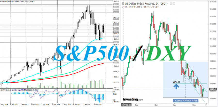 S&P 500: краткие итоги недели или состоится ли предновогоднее ралли?ИнстаФорекс - Instaforex, 2 года назад Снизившись в ходе сегодняшней азиатской торговой сессии, в начале европейской сессии доллар торгуется разнонаправленно, а его индекс DXY остается под давлением и ниже пресловутой отметки 105.00. В начале сегодняшней европейской торговой сессии фьючерсы DXY торговались вблизи отметки 104.24, соответствуя уровням начала августа. Ненадолго же хватило оптимизма покупателей доллара после завершившегося в минувшую среду заседания ФРС. Как известно и как это было ожидаемо рынком, руководители американского центрального банка повысили процентную ставку на 0,50%, снизив темпы ужесточения монетарной политики после повышений ставки на 0,75% в июне, июле, сентябре, ноябре. В минувший четверг еще 3 ключевых мировых центральных банка (Швейцарии, еврозоны, Великобритании) приняли решения относительно своих процентных ставок. Все три приняли аналогичное решение, повысив свои процентные ставки также на 0,50%. Глава ЕЦБ Кристин Лагард заявила на пресс-конференции после заседания, что, очевидно, следует ожидать дополнительного повышения ставок на 50 б.п. в течение "определенного периода времени", уточнив, что, вероятно, на следующих двух заседаниях. Эти и аналогичные "ястребиные" высказывания Лагард дали толчок росту евро, впрочем, не против доллара – он доминировал в четверг, а индекс доллара DXY укрепился более чем на 1%. Фунт же не смог воспользоваться ужесточением политики Банка Англии в четверг, значительно снизившись в четверг. Вероятно, инвесторов насторожила информация, что два члена Комитета по монетарной политике банка проголосовали за сохранение ставок без изменений. Что касается вчерашнего повышения процентной ставки НБШ на 0,50% и франка, то он лишь краткосрочно позитивно отреагировал на данное решение НБШ, а против доллара остался уязвимым, проигрывая также последнему и как защитный актив. На фоне вчерашнего бегства от рисков инвесторы предпочитали доллар - и франку, и йене, и золоту. Сегодня это бегство от рисков продолжается, судя по динамике основных мировых фондовых индексов. Так, на момент публикации данной статьи фьючерсы на европейский фондовый индекс EUROSTOXX50 торгуются вблизи отметки 3794.00, снизившись с внутри недельного максимума 4030.0 на 6,2%, а на американский фондовый индекс S&P500 торгуются вблизи отметки 3860.00, найдя поддержку на важном долгосрочном уровне, но снизившись с внутри недельного максимума 4136.00 на 7,2%. Пробой же ключевого долгосрочного уровня поддержки 3700.00 значительно повышает риски слома долгосрочного бычьего тренда S&P500 (подробнее см. в S&P 500: технический анализ и торговые рекомендации на 16.12.2022). Впрочем, несмотря на сохранение (с начала года) нисходящей динамики S&P500, участники рынка все еще надеются на, так называемое, «традиционное предновогоднее ралли» и рост на фондовом рынке, который может произойти буквально за несколько дней до конца года и может быть значительным. При этом может быть пробит не только вышеупомянутый внутри недельный максимум 4136.00, но цена в S&P500 (фьючерсах) может подняться и выше. Но из этого почти-правила бывают и исключения. В этом случае ралли не состоится, а усилившийся пессимизм заставит инвесторов искать убежища в традиционных защитных активах, в том числе в долларе, а фондовые индексы продолжат свою не