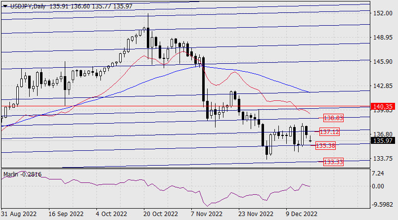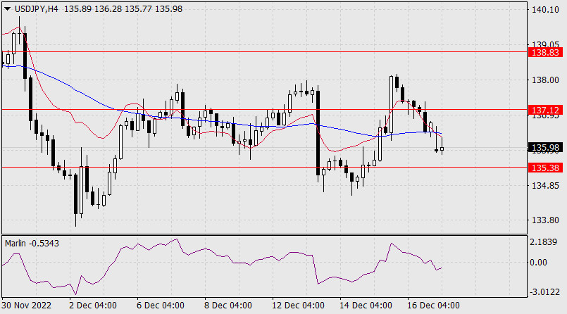 Прогноз по USD/JPY на 19 декабря 2022 годаИнстаФорекс - Instaforex, 2 года назад В пятницу пара USD/JPY вернулась в диапазон трендовых линий 135.38-137.12 после очередного ложного выхода над его верхнюю линию 137.12. ранее такие ложные выходя были 12 декабря и 6 декабря. Понедельник открылся с понижающимся разрывом около 80-ти пунктов и, не смотря на высокую верхнюю тень сегодняшней свечи, этот гэп не закрыт. Возможно, цена отработает нижний целевой уровень 135.38, но потом вернётся к 137.12 с целью закрытия разрыва. В итоге мы ждём сегодня и завтра продолжение бокового движения цены в текущем диапазоне 135.38-137.12. Далее, по основному сценарию, поддержка 135.38 будет преодолена и цена направится к цели 133.33. Осциллятор Марлин сейчас на отрицательной территории, но если ценовой боковик продолжится, то сигнальная линия осциллятора пойдёт вдоль нулевой линии. Либо продолжит медленное снижение в зоне понижающейся тенденции, показывая нам усиливающуюся перспективу ожидаемого падения.