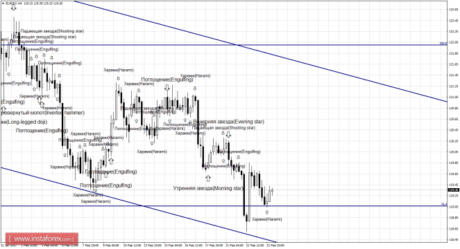 Свечной анализ EUR/JPY на 24 февраляИнстаФорекс - Instaforex, 8 лет назад Daily Котировки пары выполнили падение к уровню коррекции 23,6% - 119,05. Отбой пары от уровня Фибо 23,6% и сильная бычья формация «Молот» позволяют ожидать разворот в пользу евровалюты и некоторый рост в направлении коррекционного уровня 38,2% - 124,90. Образование новой бычьей формации будет являться еще одним трендовым сигналом, так как равноудаленный канал имеет направление «вверх» и повысит шансы пары на отбой. А закрепление курса под уровнем Фибо 23,6% повысит вероятность продолжения падения в направлении следующего уровня коррекции 0,0% - 109,56. Сетка Фибо построена по экстремумам от 8 декабря 2014 года и 24 июня 2016 года. 4h Выполнив возврат на 4-часовом графике к уровню Фибо 76,4% - 119,06, пара выполнила отбой от него, разворот в пользу валюты ЕС, и начала процесс роста в направлении коррекционного уровня 100,0% - 122,00. Образование медвежьей свечной формации 24 февраля будет трактоваться как трендовый сигнал, исходя из направления равноудаленного канала. Такая формация позволит трейдерам рассчитывать на разворот в пользу японской иены и еще один возврат к уровню коррекции 76,4%. Закрепление пары под уровнем Фибо 76,4% сработает в пользу дальнейшего падения в направлении следующего коррекционного уровня 61,8% - 117,24. Сетка Фибо построена по экстремумам от 24 июня 2016 года и 24 июня 2016 года. Уточнения: Слабые свечные формации будут отмечаться обычным текстом и размером стрелок. Сильные свечные формации будут отмечаться более жирным текстом и большим размером стрелок. Материал предоставлен компанией InstaForex - www.instaforex.com |