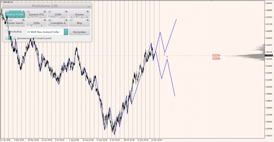 Долгосрочная тенденция: в лонг. Максимальное скопление объемов текущего контракта расположено в диапазоне, по котировкам 0.63400-0.63740. В настоящий момент по паре совершаются инвестиционные операции внутри указанного диапазона, указывая на временную неопределенность.