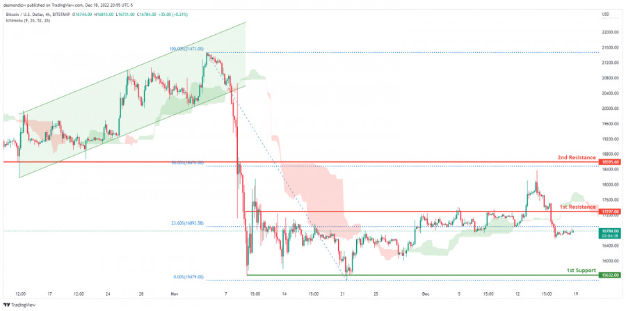 BTC/USD: ожидается усиление медвежьего импульса. Прогноз на 19 декабря 2022ИнстаФорекс - Instaforex, 2 года назад На 4-часовом графике пара BTC/USD торгуется в медвежьем тренде. В настоящее время цена находится ниже облака Ишимоку, что указывает на нисходящий импульс. Ожидается, что цена продолжит снижение к 1-му уровню поддержки 15632.00, соответствующему предыдущему уровню свинг-лоу. В альтернативном сценарии цена может направиться к 1-му уровню сопротивления 17297.00, где расположен уровень коррекции Фибоначчи 23.6%. Торговая рекомендация Вход: 17297.00 Условия для входа: повторное тестирование 1-го уровня сопротивления Тейк-профит: 15632.00 Условия для фиксации прибыли: предыдущий свинг-лоу Стоп-лосс: 18373.00 Условия для активации ордера стоп-лосс: последний уровень свинг-хай Материал предоставлен компанией InstaForex - www.instaforex.com |