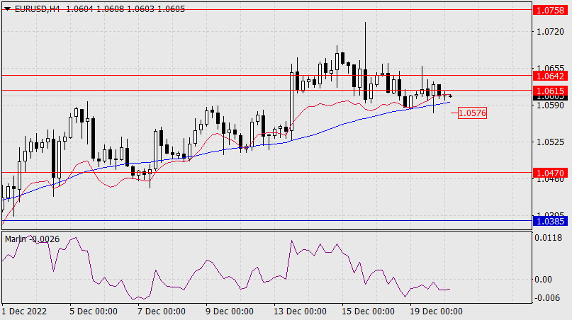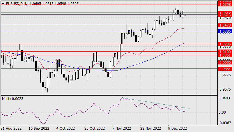 Прогноз по EUR/USD на 20 декабря 2022 годаИнстаФорекс - Instaforex, 2 года назад Вчера пара EUR/USD попыталась выйти над верхнюю границу диапазона 1.0615/42, но в итоге закрытие дня произошло под нижней границей диапазона, чем подтвердилось закрепление цены под этим уровнем (1.0615). Осталось дождаться перехода осциллятора Марлин на отрицательную территорию и тогда цена направится к целевому уровню 1.0470 более уверенно.