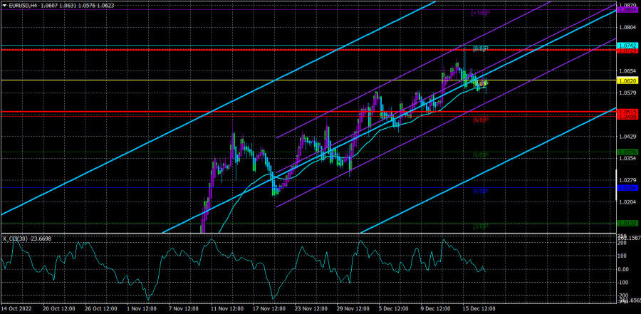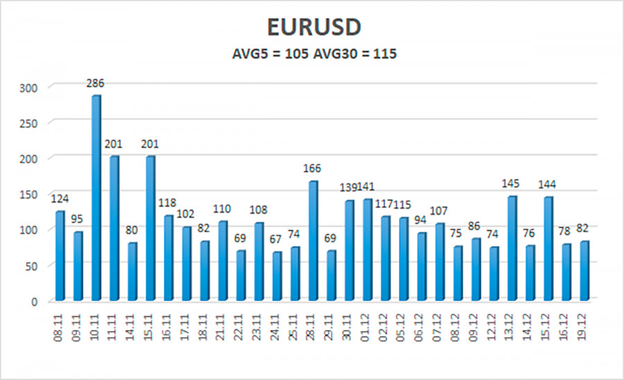 Обзор пары EUR/USD. 20 декабря. Скучный понедельник во всей красе.ИнстаФорекс - Instaforex, 2 года назад Валютная пара EUR/USD в понедельник торговалась опять, как «на поминках». На самом деле ничего удивительного в этом нет, так как в течение всего первого торгового дня недели не было ни одного важного фундаментального события или макроэкономической публикации. Странно было то, что на прошлой неделе пара показала весьма посредственную волатильность и отсутствие сильного трендового движения, так как на прошлой неделе как раз было, на что обратить внимание. А на текущей неделе обращать внимание не на что, поэтому мы не удивимся, если всю неделю будет сохраняться вялое и абсолютно безынициативное движение пары евро/доллар. Тут следует принимать во внимание еще и тот фактор, что сегодня – 20 декабря. То есть до Нового года и всего «набора праздником» остается меньше двух недель. Не то, чтобы рынок всегда с трепетом относился к новогодним праздникам и уходил в отпуск за две недели до их начала, но волатильность может серьезно снизиться просто потому, что многие трейдеры покинут рынок. На иллюстрации ниже отлично видно, как снизилась волатильность в последние недели. Если не брать в расчет два дня на прошлой неделе по 145 пунктов, то в среднем пара сейчас проходит за сутки около 70-80 пунктов. А по диаграмме отлично видно, как падает волатильность с приближением новогодних праздников. Возвращаясь к понедельнику, фундаментального фона не было никакого. Мы не считаем выступление Луиса де Гиндоса важным, так как оно состоялось через несколько дней после заседания ЕЦБ. Мы еще поговорим о нем чуть ниже, но лишь в рамках проформы. С технической точки зрения, пара сейчас находится около мувинга. Чтобы определить начало возможной сильной нисходящей коррекции, которую мы ждем уже несколько недель, требуется хотя бы преодоление этого самого мувинга. Но уже не лишь бы какое преодоление, а уверенное. В принципе, у пары даже «лишь бы каким-то» преодолением в последние недели были серьезные проблемы. Мы не устаем повторять, что весь последний виток роста евровалюты можно считать процентов на 70% не обоснованным. В течение последнего месяца цена не могла даже скорректироваться больше, чем на 100-150 пунктов. Поэтому ничего другого не остается, кроме как ждать коррекцию. Луис де Гиндос: ставки будут расти.В принципе, по названию этого абзаца уже ясна суть выступления вице-председателя ЕЦБ. Он сообщил рынку просто «нереальную» новость. Естественно, что Кристин Лагард и ее «зам» выступают довольно часто, а их риторика не меняется от выступления к выступлению. Поэтому мы и не можем сказать, что речь де Гиндоса была важной и повлияла на настрой рынка. Также господин де Гиндос заявил, что не может сказать, до какого предела вырастет ставка ЕЦБ в конечном итоге. То есть на самый главный сейчас вопрос для евровалюты де Гиндос ответа как раз и не дал. Поясним, почему этот вопрос является самым главным. ЕЦБ начал замедлять темпы ужесточения монетарной политики тогда, когда инфляция еще толком не начала замедляться, ибо одно снижение – это не тенденция. Следовательно, он уже отступил назад в борьбе с инфляцией. Если речь идет о том, что европейский регулятор будет повышать ставку «до победного конца» просто более слабыми темпами, тогда все хорошо. Если же он будет повышать ставку с о