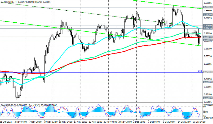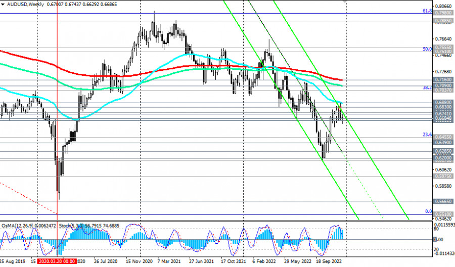 AUD/USD: технический анализ и торговые рекомендации на 20.12.2022ИнстаФорекс - Instaforex, 2 года назад Как мы отметили в нашем сегодняшнем «Фундаментальном анализе», сегодня AUD/USD протестировала важный долгосрочный уровень поддержки 0.6665 (ЕМА50 на дневном графике). С середины октября AUD/USD находится в восходящей коррекции, оттолкнувшись от локального круглого уровня поддержки 0.6200, и в середине этого месяца предприняла попытку прорыва в зону среднесрочного бычьего рынка, протестировав на пробой долгосрочный уровень сопротивления 0.6830 (ЕМА200 на дневном графике), и даже ненадолго превысила уровень сопротивления 0.6880 (ЕМА50 на недельном графике). Однако пока что эта попытка не увенчалась успехом: в последние 3 торговых дня пара снижалась, а сегодня предприняла попытку пробоя уровня поддержки 0.6665. При этом технические индикаторы OsMA и Стохастик на дневном и недельном графиках пары находятся на стороне продавцов, также свидетельствуя о преобладании нисходящей динамики. Таким образом, ждем подтверждённый пробой этого уровня и дальнейшее снижение вглубь нисходящего канала на недельном графике в сторону его нижней границы, проходящей вблизи отметки 0.5900. При этом промежуточные цели расположены на отметках 0.6455, 0.6390, 0.6285, 0.6200. В альтернативном сценарии AUD/USD все же прорвется в зону выше уровней сопротивления 0.6830, 0.6880, демонстрируя решимость двигаться дальше в сторону ключевых уровней сопротивления 0.7090 (ЕМА144 на недельном графике), 0.7160 (ЕМА200 на недельном графике). Но, скорее всего, в зоне уровней сопротивления 0.6830, 0.6880 AUD/USD ждет очередной отбой и дальнейшее движение по нашему основному (негативному для пары) сценарию. *) о событиях недели см. в Важнейшие экономические события недели 19.12.2022 – 25.12.2022 **) об особенностях торговли парой AUD/USD см. в статье AUD/USD: валютная пара (характеристики, рекомендации) Уровни поддержки: 0.6684, 0.6665, 0.6600, 0.6500, 0.6455, 0.6390, 0.6285, 0.6200, 0.6170, 0.5975, 0.5665, 0.5510 Уровни сопротивления: 0.6741, 0.6760, 0.6800, 0.6830, 0.6880