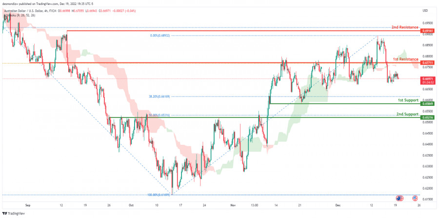 AUD/USD: ожидается усиление медвежьего импульса. Прогноз на 20 декабря 2022ИнстаФорекс - Instaforex, 2 года назад На 4-часовом графике пара AUD/USD торгуется в медвежьем тренде. В настоящее время цена находится ниже облака Ишимоку, что указывает на нисходящий импульс. Если медвежий импульс сохранится, ожидается, что цена продолжит снижение к 1-му уровню поддержки 0.65849, соответствующему уровню коррекции Фибоначчи 78.6%. В альтернативном сценарии цена может вернуться к 1-му уровню сопротивления 0.67711, где расположен уровень коррекции Фибоначчи 61.8%. Торговая рекомендация Вход: 0.67711 Условия для входа: повторное тестирование 1-го уровня сопротивления Тейк-профит: 0.65849 Условия для фиксации прибыли: 1-й уровень поддержки Стоп-лосс: 0.68932 Условия для активации ордера стоп-лосс: последний уровень свинг-хай Материал предоставлен компанией InstaForex - www.instaforex.com |