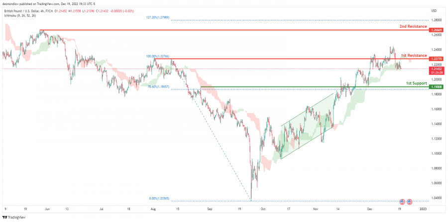 GBP/USD развивает бычий импульс. Прогноз на 20 декабря 2022 г.ИнстаФорекс - Instaforex, 2 года назад На 4-часовом графике пара GBP/USD торгуется в бычьем тренде. В настоящее время цена пересекает облако Ишимоку, что указывает на восходящий импульс. Ожидается, что цена продолжит рост к 1-му уровню сопротивления 1.22770, где расположен предыдущий уровень свинг-хай. В альтернативном сценарии цена может развернуться вниз, чтобы повторно протестировать 1-й уровень поддержки 1.19008, соответствующий уровню коррекции Фибоначчи 78.6%. Торговая рекомендация Вход: 1.22770 Условия для входа: повторный тест 1-го уровня сопротивления Тейк-профит: 1.19008 Условия для фиксации прибыли: 1-й уровень поддержки Стоп-лосс: 1.24465 Условия для активации ордера стоп-лосс: последний уровень свинг-хай Материал предоставлен компанией InstaForex - www.instaforex.com |