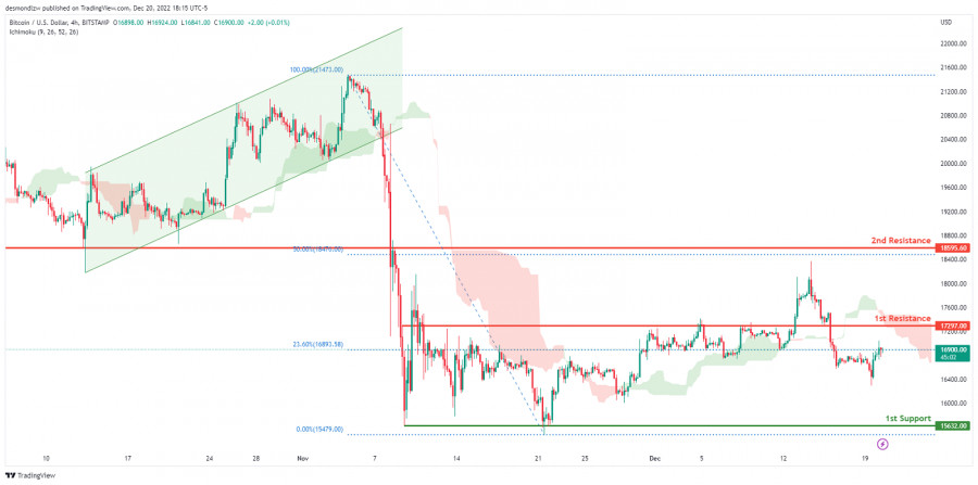 BTC/USD: ожидается дальнейшее развитие нисходящей тенденции. Прогноз на 21 декабря 2022ИнстаФорекс - Instaforex, 2 года назад На 4-часовом графике пара BTC/USD торгуется в медвежьем тренде. В настоящее время цена находится ниже облака Ишимоку, что указывает на нисходящий импульс. Ожидается, что цена продолжит снижение к 1-му уровню поддержки 15632.00, где расположен предыдущий уровень свинг-лоу. В альтернативном сценарии цена может направиться к 1-му уровню сопротивления 17297.00, соответствующему уровню коррекции Фибоначчи 23.6%. Торговая рекомендация Вход: 17297.00 Условия для входа: повторное тестирование 1-го уровня сопротивления Тейк-профит: 15632.00 Условия для фиксации прибыли: предыдущий уровень свинг-лоу Стоп-лосс: 18373.00 Условия для активации ордера стоп-лосс: последний уровень свинг-хай Материал предоставлен компанией InstaForex - www.instaforex.com |
