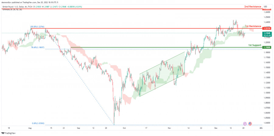 GBP/USD развивает медвежий импульс. Прогноз на 21 декабря 2022ИнстаФорекс - Instaforex, 2 года назад На 4-часовом графике пара GBP/USD торгуется в медвежьем тренде. В настоящее время цена находится ниже облака Ишимоку, что указывает на нисходящий импульс. Если медвежий импульс сохранится, ожидается, что цена направится к 1-му уровню поддержки 1.19008, где расположен уровень коррекции Фибоначчи 78.6%. В альтернативном сценарии цена может вернуться к 1-му уровню сопротивления 1.22770, соответствующему предыдущему уровню свинг-хай. Торговая рекомендация Вход: 1.22770 Условия для входа: повторный тест 1-го уровня сопротивления Тейк-профит: 1.19008 Условия для фиксации прибыли: 1-й уровень поддержки Стоп-лосс: 1.24465 Условия для активации ордера стоп-лосс: последний уровень свинг-хай Материал предоставлен компанией InstaForex - www.instaforex.com |