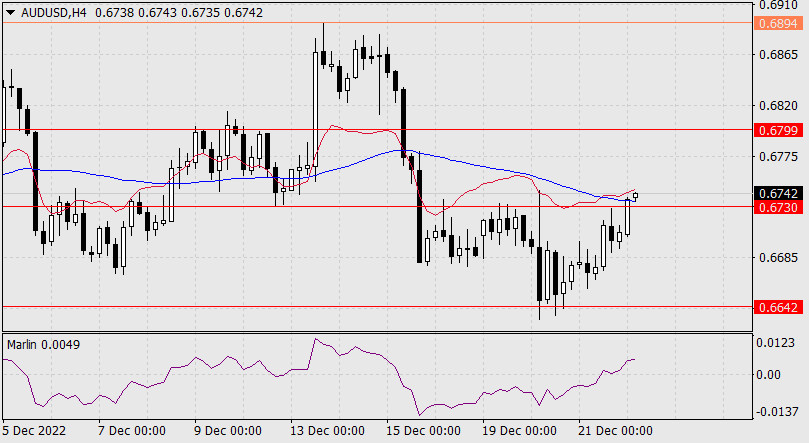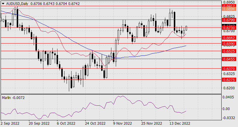 Прогноз по AUD/USD на 22 декабря 2022 годаИнстаФорекс - Instaforex, 2 года назад Австралийский доллар во вторник отработал целевую поддержку 0.6642, а теперь выходит над сопротивление 0.6730. Закрепление над уровнем позволит цене продолжить рост до ближайшего сопротивления 0.6799. В этом случае осциллятор Марлин уже окажется в положительной области (выше нулевой линии) и, после закрепления на 0.6799 пара AUD/USD сможет штурмовать диапазон 0.6894-0.6917.