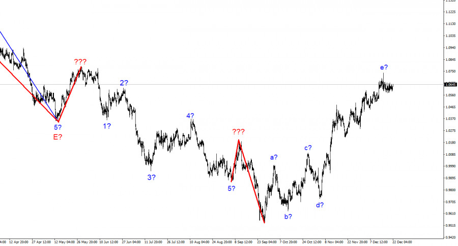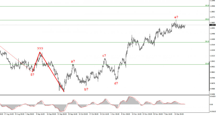 Анализ EUR/USD. 22 декабря. Рынок предпочитает подождать 2023 года.ИнстаФорекс - Instaforex, 2 года назад Волновая разметка 4-часового графика для инструмента Евро/Доллар по-прежнему выглядит вполне убедительно, но весь повышательный участок тренда продолжает усложняться. Он уже принял ярко выраженный коррекционный и довольно протяженный вид. Мы получили сложную коррекционную структуру волн a-b-c-d-e, в которой волна e имеет гораздо более сложный вид, чем первые четыре волны. Если текущая волновая разметка верна, то построение этой структуры может близится к своему завершению или уже завершена, так как пик волны e намного превышает пик волны с. В этом случае нас ожидает построение минимум трех волн вниз, но если последний участок тренда был коррекционным, то следующий – может быть импульсным. Поэтому я готовлюсь к сильному снижению инструмента. Однако начаться оно может уже в следующем году, так как в этом рынок показывает всем свои видом, что предпочитает подождать. Неудачная попытка прорыва отметки 1,0726, что соответствует 200,0% по Фибоначчи, указывает на готовность к продажам. Спрос на валюту США по-прежнему не растет, хотя для этого, казалось бы, есть уже все необходимое. Внутренняя волновая структура волны e – очень неоднозначная. В ней с трудом можно выделить подволны. Отчет по ВВП США, повлияет ли на настроение рынка?Инструмент Евро/Доллар в среду снизился на 20 базовых пунктов. Но, как я уже говорил в прошлых своих обзорах, читатели не должны вводится в заблуждение этими цифрами, так как они достаточно условные. Инструмент не может при флэте открывать и закрывать дни на одном и том же ценовом значении. Следовательно, при любом раскладе будет либо определенное повышение котировок, либо снижение. Зато то, что инструмент движется горизонтально, это неоспоримый факт. Такое движение может продолжаться в ближайшее время, так как на этой неделе – католическое рождество, а на следующей – Новый год. В это время каждый год активность рынка снижается. А раз нет активности, то нет и движений. Сегодня новостной фон может порадовать рынки, так как сегодня выйдет отчет по ВВП в третьем квартале США. Сразу оговорюсь, что это последняя оценка показателя за третий квартал, и рынок уже ознакомлен с двумя предыдущими, которые показали рост экономики на 2,9% в квартальном выражении. Вероятнее всего, сегодня мы увидим такую же цифру. Даже если будет отклонение от ожиданий, я не думаю, что рынок с жаром кинется отыгрывать этот отчет. Таким образом, сегодня опять возможно горизонтальное движение, которое никак не влияет на текущую волновую разметку. Следовательно, я не могу сделать никаких новых выводов по движению инструмента. Также отмечу, что в ближайшее время не состоится ни одного выступления членов ЕЦБ или ФРС. Все те же новогодние праздники и многие чиновники уходят в отпуск. Общие выводы.Исходя из проведенного анализа, я делаю вывод, что построение восходящего участка тренда усложнилось до пяти волнового и близится к своему завершению. Таким образом, советую продажи с целями, расположенными около расчетной отметки 0,9994, что соответствует 323,6% по Фибоначчи. Есть вероятность усложнения повышательного участка тренда и принятия им еще более протяженного вида, и вероятность этого сценария остается высокой, но теперь у нас хотя бы есть сигнал на понижение, от кото