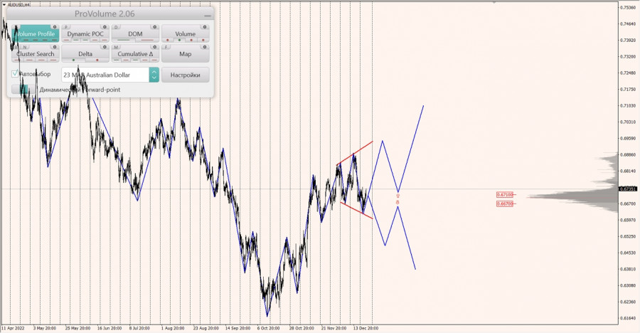 Долгосрочная тенденция: временная неопределенность (расширяющийся треугольник). Максимальное скопление объемов текущего контракта расположено в диапазоне по котировкам 0.66700-0.67100. В настоящий момент по паре совершаются инвестиционные операции выше, указывая на силу покупателей.