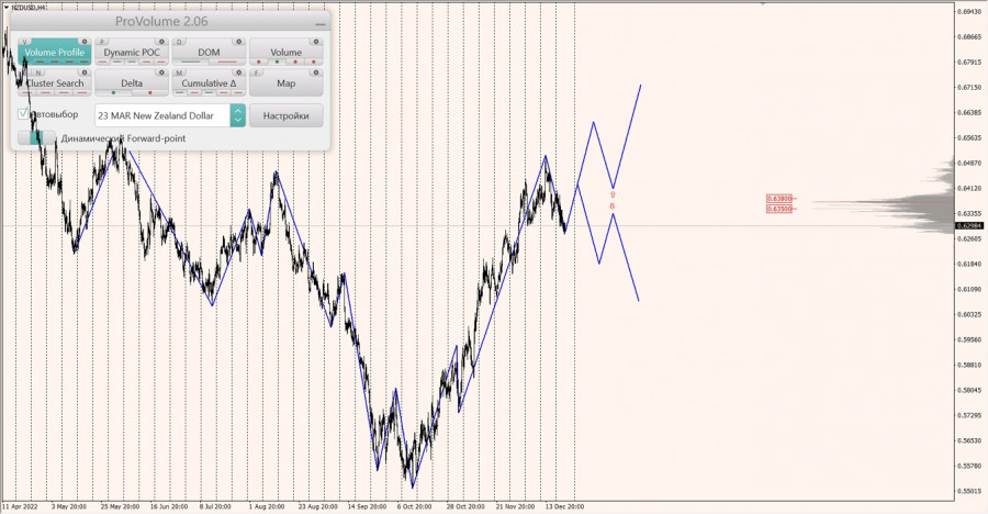 Долгосрочная тенденция: в лонг. Максимальное скопление объемов текущего контракта расположено в диапазоне по котировкам 0.63500-0.63800. В настоящий момент по паре совершаются инвестиционные операции ниже, указывая на слабость покупателей.