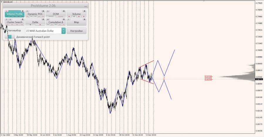 Долгосрочная тенденция: временная неопределенность (расширяющийся треугольник). Максимальное скопление объемов текущего контракта расположено в диапазоне по котировкам 0.66700-0.67100. В настоящий момент по паре совершаются инвестиционные операции ниже, указывая на силу продавцов.