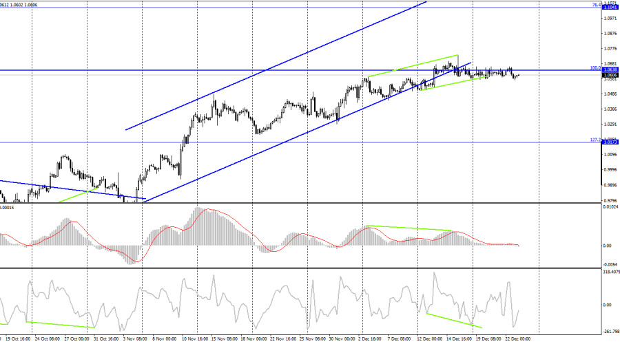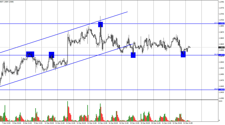 EUR/USD. 23 декабря. ФРС может отказаться от дальнейшего повышения ставокИнстаФорекс - Instaforex, 2 года назад Добрый день, уважаемые трейдеры! Пара EUR/USD в четверг выполнила новое падение к уровню коррекции 161,8% - 1,0574 и отбой от него. Это уже второй по счету отбой от этого уровня, но на расстояние вытянутой руки пара подходила к нему гораздо больше раз. Однако горизонтальное движение сохраняется, а отбой от уровня 1,0574 опять позволяет рассчитывать трейдерам на рост на 60-70 пипсов. Закрытие курса пары под 1,0574 сработает в пользу валюты США и падения в направлении уровня Фибо 200,0% - 1,0430. Вчера в США вышел отчет по ВВП, который никакого влияния на движения пары не оказал. Американская экономика выросла в третьем квартале на 3,2% кв/кв после падения на 0,6% в предыдущем. Однако слишком много внимания этому отчету я уделять не буду, так как трейдеры его проигнорировали. Очень интересная информация поступила от одного из аналитиков Bloomberg, который огорошил рынок словами о том, что ФРС может отказаться от дальнейшего повышения процентной ставки. Напомню, что консенсус-мнение сейчас предполагает еще два повышения ставки в начале 2023 года, на 0,50% и на 0,25%. Однако Саймон Уайт заметил, что начиная с 1972 года последнее повышение ставки на фоне высокой инфляции происходило через 22 недели после того, как инфляция достигала своего максимального значения. В этом году максимальное значение в 9,1% было достигнуто в июле, с тех прошло как раз 22 недели. Также Уайт отметил, что первое снижение ставки после завершения цикла ужесточения ДКП происходило обычно через 16 недель. Если его расчеты верны, то ФРС может первый раз понизить ставку в апреле следующего года. Отмечу, что подобная теория пока что не подтверждается самой ФРС и ее представителями, которые продолжают утверждать, что ставка будет продолжать расти, а инфляция остается слишком высокой. Однако я бы рекомендовал не относится к словам Уайта, как к фантазии. ФРС может преподнести сюрприз в феврале 2023 года, а инфляция к тому времени может замедлиться настолько, что ставку повышать уже не нужно будет. На 4-часовом графике пара выполнила разворот в пользу американского доллара после образования «медвежьей» дивергенции у индикатора MACD и закрепление под уровнем Фибо 100,0%, что позволяет ожидать продолжение падения. Также было выполнено закрытие под восходящим коридором. «Бычья» дивергенция у индикатора CCI назревает уже несколько дней, и она может вернуть на рынок быков, но пара пока предпочитает двигаться горизонтально. Отчет Commitments of Traders (COT):