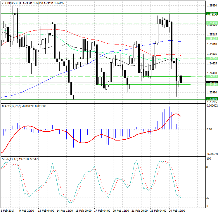 Агрессивные продажи GBP/USD могут продолжиться сегодня...FxTeam - FxPro, 8 лет назад Обратив внимание на 4-х часовой график можно заметить, что:курс валюты вновь встретил значительное сопротивление возле уровня 1.2565,с американской сессии прошлой пятницы в данной валютной паре доминируют медвежьи настроения, в результате чего были отработаны наши цели 1.25125, 1.2470 и 1.24325,снижение котировок замедлилось при подходе к сильному уровню поддержки 1.2385... GBP/USDТеперь посмотрим на индикаторы: Курс валюты закрепился ниже скользящих средних с периодами 55, 34, 89 и 144, которые теперь являются рядом уровней сопротивления 1.2465/675, 1.24775 и 1.25075. Гистограмма MACD пересекла нулевую линию сверху вниз, теперь расположена в отрицательной зоне и ниже своей сигнальной линии, продолжает плавно снижаться и тем самым подает сигнал на продажу британского фунта (GBP). Осциллятор стохастик вплотную приблизился к зоне перепроданности и формирует аналогичный сигнал, поскольку линия %К опускается ниже линии %D. Несмотря на два одинаковых и четких сигнала, в качестве подтверждения того, что на рынке форекс в данной валютной паре вновь могут усилиться медвежьи настроения, желательно дождаться пробоя сильного уровня поддержки 1.2385, который может открыть путь к уровням 1.2330 и 1.2300. Уровни сопротивления: 1.24325, 1.2465/675/70, 1.24775, 1.25075 Текущая цена: 1.2420 Уровни поддержки: 1.2415, 1.2400, 1.2385, 1.2340/30, 1.2300 |