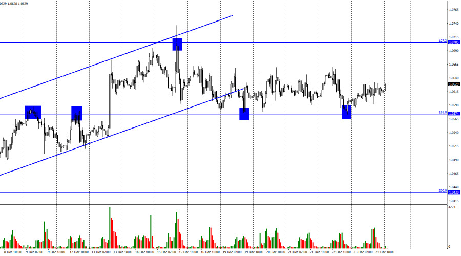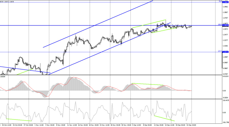 EUR/USD. 26 декабря. Потребительские расходы в США замедляютсяИнстаФорекс - Instaforex, 2 года назад Добрый день, уважаемые трейдеры! Пара EUR/USD в пятницу продолжала очень слабый процесс роста после отбоя от уровня коррекции 161,8% - 1,0574. Ранее я уже говорил, что сейчас очень сложно ожидать роста к уровню 1,0705, максимум – на 60-70 пипсов. Таким образом, уже сегодня или завтра котировки пары могут выполнить возврат к уровню 1,0574 с новым отбоем от него. Движение остается горизонтальным. Информационный фон в пятницу присутствовал, и это уже очень хорошо. Забегая немного вперед, следует отметить, что никакого влияния на настроение трейдеров, он не оказал, хотя некоторые отчеты были достаточно важными. Прежде всего, я хочу отметить так называемый «любимый индикатор ФРС» - индекс расходов на личное потребление. По итогам ноября он составил 0,1% м/м и 5,5% г/г. Это один из самых медленных темпов роста за последний год, который свидетельствует о том, что потребительские расходы замедляются, чего и пытается добиться всеми силами ФРС. Потребительские расходы – это 2/3 инфляции. Чтобы снизить инфляцию, нужно в первую очередь бороться с растущим спросом. ФРС повышает ставку уже почти целый год, повышая стоимость заимствований, что значительно снижается объемы кредитования, повышая одновременно желание инвестировать в депозиты или казначейские облигации. Соответственно, замедление потребительских расходов сигнализирует о том, что инфляция тоже будет снижаться. Для американской валюты это не очень хорошо, так как снижение инфляции понижает необходимость ФРС продолжать повышать ставку. Однако европейский центральный банк тоже начал замедлять темпы ужесточения денежно-кредитной политики, поэтому, на мой взгляд, евро и доллар сейчас находятся приблизительно в равных условиях. Новогодние праздники значительно снизили желание трейдеров торговать. Из-за этого сейчас довольно сложно делать какие-либо выводы, так как движений на рынке практически нет. На 4-часовом графике пара выполнила разворот в пользу американского доллара после образования «медвежьей» дивергенции у индикатора MACD и закрепление под уровнем Фибо 100,0%, что позволяет ожидать продолжение падения. Также было выполнено закрытие под восходящим коридором. Но пара пока предпочитает двигаться горизонтально. Отчет Commitments of Traders (COT):
