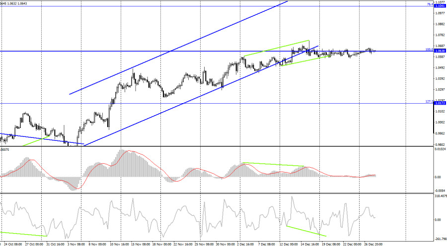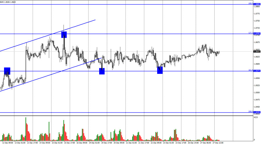 EUR/USD. 28 декабря. Евро перевыполнил план и готов взять цель на 1,0705ИнстаФорекс - Instaforex, 2 года назад Добрый день, уважаемые трейдеры! Пара EUR/USD во вторник продолжала процесс роста в первой половине дня, но во второй выполнила разворот в пользу валюты США и начала процесс падения в направлении коррекционного уровня 161,8% - 1,0574. Может показаться, что в течение дня или последних дней трейдеры торговали достаточно активно, но это не так. Все движения сейчас очень слабые. После отбоя от уровня 1,0574 евровалюта выполнила рост на 100 пипсов, перевыполнив план. Ранее она могла подняться только на 60-70 пипсов. Теперь трейдеры-быки могут замахнуться и на уровень 1,0705, но в целом пара продолжает торговаться горизонтально. Про информационный фон сказать сейчас особенно нечего, так как уже полторы недели практически нет важных отчетов или других событий. В конце прошлой недели в США вышел отчет по ВВП за третий квартал, но пара уже полторы недели движется горизонтально, поэтому тот отчет не повлиял на настроение трейдеров настолько, чтобы тренд возобновился. Если реакция и имела место, она была слишком слабой. А что вы хотите? Рождество, Новый год, трейдеры тоже люди, хотят отдыхать, не говоря уже о политиках, различных чиновниках. Если ранее мы регулярно сталкивались с различными выступлениями, то сейчас и этого нет. Таким образом, я считаю, что до конца текущего года пара будет оставаться между уровнями 1,0574 и 1,0705. Далее все будет зависеть от информационного фона, у которого сейчас главная задача не поддержать евро или доллар, а просто вывести трейдеров из состояния анабиоза. К слову, в конце следующей недели выйдет отчет по инфляции в Евросоюзе, который может возвестить о новом замедлении. Если это произойдет, то европейская валюта может начать падение, так как оснований повышать процентную ставку высокими темпами у ЕЦБ станет еще меньше. Напомню, что последнее падение доллара могло быть связано именно с замедлением роста ставки, только ФРС. На 4-часовом графике пара предпочитает двигаться горизонтально. Таким образом, закрытия над или под уровнем коррекции 100,0% - 1,0638 сейчас не являются сигналами. Дивергенции, которые образовываются время от времени, тоже не имеют никакой силы. Отчет Commitments of Traders (COT):