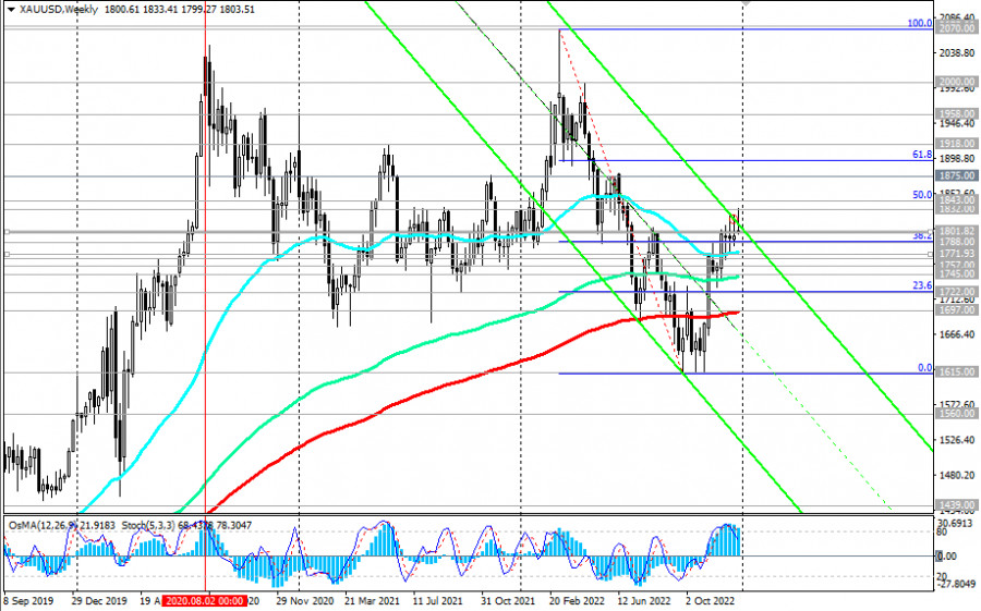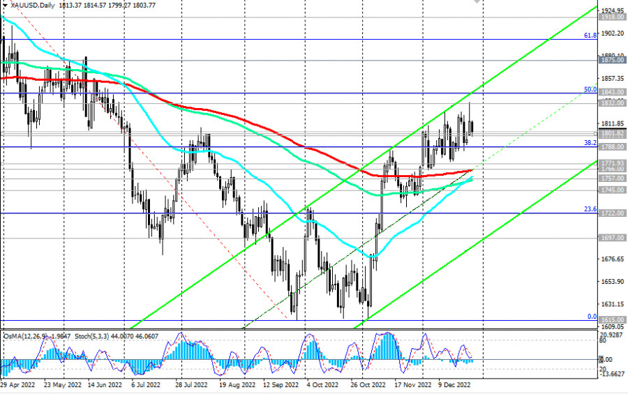 XAU/USD: технический анализ и торговые рекомендации на 28.12.2022ИнстаФорекс - Instaforex, 2 года назад XAU/USD торгуется в зоне бычьего рынка, выше ключевых уровней поддержки 1800.00, 1766.00 (ЕМА200 на дневном графике), 1697.00 (ЕМА200 на недельном графике). Сохраняется восходящая динамика, и пробой сегодняшнего локального максимума 1814.00 станет сигналом для наращивания длинных позиций. В альтернативном сценарии цена пробьёт уровни поддержки 1802.00 (ЕМА200 на 1-часовом графике), 1800.00 и продолжит снижаться в сторону ключевого уровня поддержки 1766.00. Пробой же уровней поддержки 1697.00 (ЕМА200 на недельном графике), 1678.00 (ЕМА50 на месячном графике) поставит под угрозу весь долгосрочный бычий тренд золота, направив XAU/USD внутрь нисходящего канала на недельном графике пары. Однако этот сценарий мало вероятен, учитывая слабеющий доллар и сильный фундаментальный фон (см. наш сегодняшний «Фундаментальный анализ»). В текущей ситуации предпочтительными выглядят длинные позиции. *) об особенностях торговли XAU/USD см. также XAU/USD: валютная пара (характеристики, рекомендации) Уровни поддержки: 1802.00, 1800.00, 1788.00, 1772.00, 1766.00, 1757.00, 1745.00, 1722.00, 1697.00, 1678.00 Уровни сопротивления: 1814.00, 1832.00, 1843.00, 1875.00