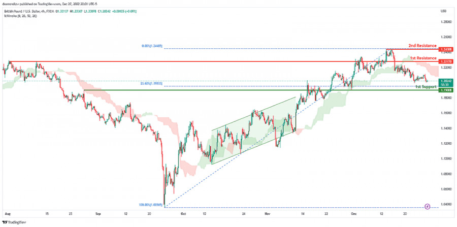 GBP/USD: ожидается усиление медвежьего импульса. Прогноз на 28 декабря 2022ИнстаФорекс - Instaforex, 2 года назад На 4-часовом графике пара GBP/USD торгуется в медвежьем тренде. В настоящее время цена находится ниже облака Ишимоку, что указывает на нисходящий импульс. Если этот импульс сохранится, ожидается, что цена продолжит движение к 1-му уровню поддержки 1.19008, где расположен уровень коррекции Фибоначчи 23.6%. В альтернативном сценарии цена может развернуться вверх, чтобы повторно протестировать 1-й уровень сопротивления 1.22770, соответствующий предыдущему уровню свинг-хай. Торговая рекомендация Вход: 1.22770 Условия для входа: вход в продажу по лимитному ордеру на 1-м уровне сопротивления Тейк-профит: 1.19008 Условия для фиксации прибыли: 1-й уровень поддержки Стоп-лосс: 1.24465 Условия для активации ордера стоп-лосс: последний уровень свинг-лоу Материал предоставлен компанией InstaForex - www.instaforex.com |