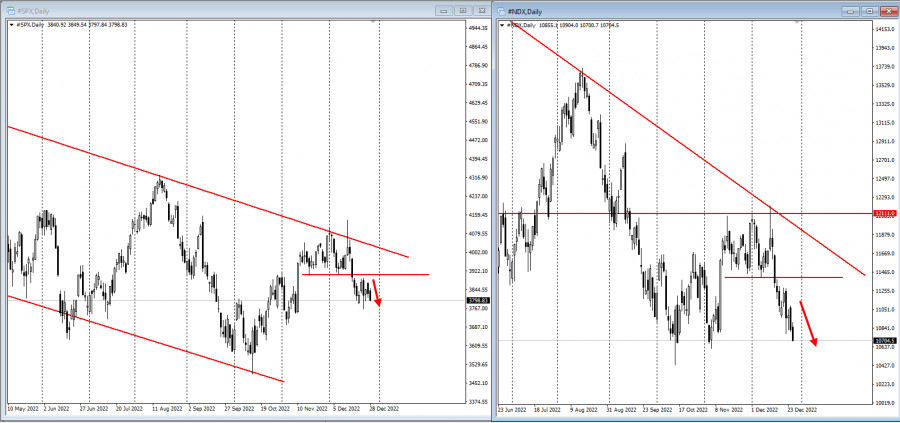 "Новогоднее ралли" превращается в ПИКЕ для фондового рынка США.ИнстаФорекс - Instaforex, 2 года назад Фондовые индексы США падают второй день подряд на этой неделе из-за вялых праздничных торгов, а доходность казначейских облигаций выросла, так как надежды на ралли в конце года не оправдались. S&P 500 упал, поскольку настроения ухудшились из-за опасений, что прекращение политики Китая по борьбе с COVID-19 может привести к росту числа случаев заболевания во всем мире. В это время объемы торгов были на 20% ниже среднего за 30 дней. Доходность 10-летних облигаций подскочила до 3,88%, а нефть упала. Акции технологических компаний в США оставались под давлением, даже несмотря на то, что Tesla Inc. пыталась остановить семидневное падение, вызванное опасениями по поводу снижения спроса. Датчик доллара стер потери. Европейские фондовые индексы перешли к снижению, но не так активно: Все еще осторожный настрой ослабляет надежды на ралли в последнюю торговую неделю 2022 года после тяжелого для финансовых рынков года. Мировые акции потеряли пятую часть своей стоимости, что стало самым большим падением с 2008 года в годовом исчислении, а индекс мировых облигаций упал на 16%. Доллар вырос на 7%, а доходность 10-летних облигаций США подскочила до 3,80% с 1,5% в конце 2021 года. «Мы считаем, что инвесторы стали слишком пессимистичными, учитывая, где мы находимся в цикле повышения ставок», — написала Нэнси Тенглер, генеральный директор и главный инвестиционный директор Laffer Tengler Investments. После одного из самых быстрых режимов повышения ставок в истории «мы ожидаем, что экономика существенно замедлится или войдет в рецессию в какой-то момент в 2023 году. Конечно, серьезная рецессия будет медвежьей для акций, но, учитывая устойчивость экономики США и напряженный рынок труда, мы ожидаем замедления или неглубокой и краткосрочной рецессии. Это может позволить акциям вырасти во второй половине 2023 года». На этом фоне Индекс Московской Биржи перешёл к снижению: Новости на этой неделе: