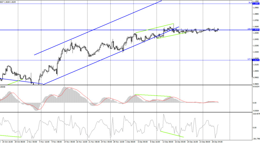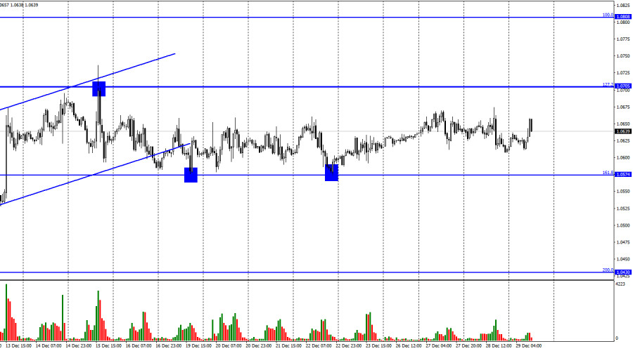 EUR/USD. 29 декабря. 2,5 недели горизонтального движенияИнстаФорекс - Instaforex, 2 года назад Добрый день, уважаемые трейдеры! Пара EUR/USD в среду окончательно забросила все попытки показать рост или падение и теперь движется точно между уровней 1,0574 и 1,0705. Так как указанные уровни даже не достигаются, трейдеры лишены сейчас сигналов. Движение абсолютно горизонтальное, даже если бы сигналы образовывались, получить прибыль по ним было бы крайне сложно. Информационный фон в данное время отсутствует, чем и объясняется горизонтальное движение пары. Безусловно, проблема не только в отсутствии новостей и отчетов, а еще и в праздничном статусе нынешней недели. Но горизонтальное движение началось еще 2,5 недели назад. Трейдеры явно начали готовиться к праздникам заранее. Таким образом, ничего нового по картине валютной пары евро-доллар сказать сейчас я не могу. В январе трейдеры наверняка предпримут попытку вырваться из бокового коридора и по тому, какую линию удастся преодолеть, и можно будет определить направление дальнейшего движения. Я считаю, что более вероятно закрытие под уровнем коррекции 161,8% - 1,0574, однако за минувшие 2,5 недели медведи никакого влияния на движение пары не оказали, хотя графический анализ указывает на необходимость коррекции. Ближайшая надежда трейдеров связана с отчетом по инфляции в ЕС, который выйдет на следующей неделе. На мой взгляд, от инфляции можно ожидать нового сильного снижения, так как ЕЦБ дважды подряд повысил процентную ставку на 0,75% (а потом еще и на 0,50%). Если инфляция начнет замедляться более быстрыми темпами, то темпы повышения ставки могут замедлиться еще сильнее, но я не жду от этого показателя быстрого падения, так как те три повышения ставки, о которых сказано выше, это суммарно 2,5% (вместе с самым первым повышением). 2,5% - это нейтральный уровень ставки, который не приводит к ограничительному эффекту в экономике. Таким образом, сильного падения индекса потребительских цен не стоит. На 4-часовом графике пара предпочитает двигаться горизонтально. Таким образом, закрытия над или под уровнем коррекции 100,0% - 1,0638 сейчас не являются сигналами. Дивергенции, которые образовываются время от времени, тоже не имеют никакой силы. Отчет Commitments of Traders (COT):
