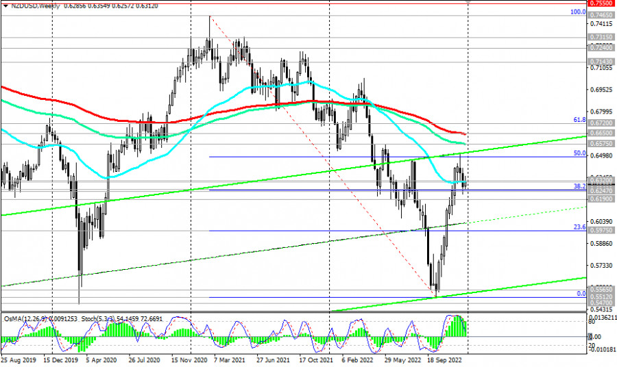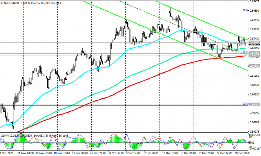 NZD/USD: технический анализ и торговые рекомендации на 29.12.2022ИнстаФорекс - Instaforex, 2 года назад Оттолкнувшись в середине октября от многолетнего минимума 0.5512, NZD/USD продолжает развивать восходящую коррекцию, сумев также в прошлом месяце преодолеть сильный уровень сопротивления 0.6260 (ЕМА200 на дневном графике). На текущий момент пара торгуется в зоне сильного долгосрочного уровня сопротивления 0.6320 (ЕМА50 на недельном графике). Его уверенный пробой, отметили мы в нашем сегодняшнем «Фундаментальном анализе», создаст предпосылки для дальнейшего роста пары в сторону ключевого уровня сопротивления 0.6650 (ЕМА200 на недельном графике), отделяющего долгосрочный бычий рынок от медвежьего. Пробой локальных уровней сопротивления 0.6348, 0.6354 станет подтверждающим сигналом для реализации данного сценария. В альтернативном сценарии первым сигналом для возобновления коротких позиций станет пробой сегодняшнего локального минимума 0.6295, а подтверждающим – пробой уровня поддержки 0.6247 (ЕМА200 на 4-часовом графике). *) об особенностях торговли NZD также см. в статьях