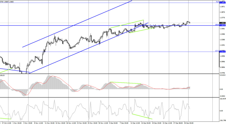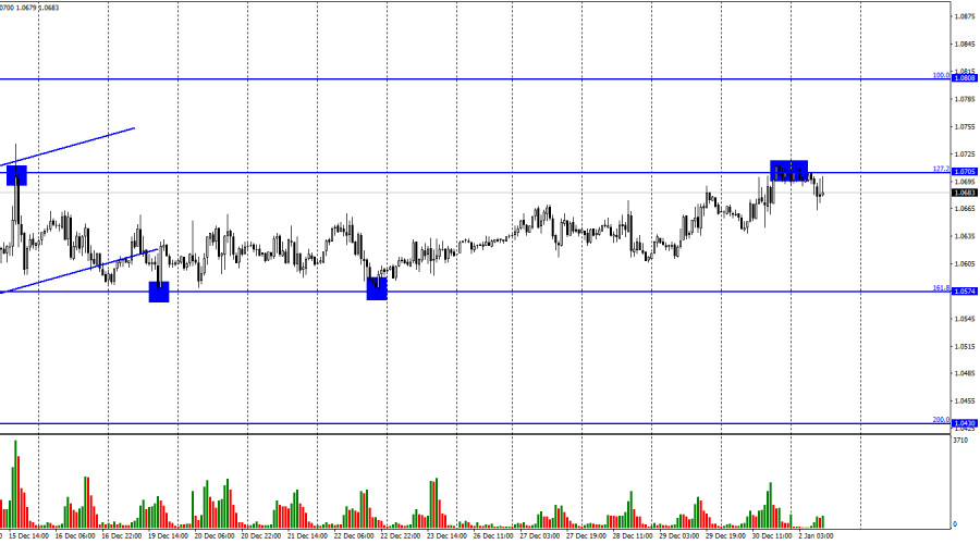 EUR/USD. 2 января. Евро вновь спасовал около уровня 1,0705ИнстаФорекс - Instaforex, 2 года назад Добрый день, уважаемые трейдеры! Пара EUR/USD в пятницу продолжала торговаться между уровнями 1,0574 и 1,0705. Лишь в пятницу вечером котировки достигли уровня 1,0705, от которого впоследствии был выполнен отбой. Таким образом, разворот в пользу американской валюты позволяет предполагать некоторое падение котировок в направлении уровня 1,0574. Горизонтальное движение сохраняется. Закрытие курса пары над 1,0705 повысит вероятность дальнейшего роста евровалюты в направлении следующего уровня Фибо 100,0% – 1,0808. Понедельник обещает быть весьма скучным. В последние полторы недели информационный фон фактически отсутствовал, на этой неделе ситуация будет немного выправляться, но важных новостей и отчетов все равно придется ждать до конца недели. В пятницу в Евросоюзе выйдет отчет по инфляции за декабрь, а в США – Nonfarm Payrolls. Безусловно, на этих отчетах и будет сфокусировано внимание трейдеров на этой неделе. Напомню, что сейчас многое для ЕЦБ и ФРС зависит от состояния рынка труда и инфляции. Оба центральных банка уже начали смягчать свои подходы к ДКП, однако ФРС это делает после почти полугодичного падения инфляции, а ЕЦБ – после снижения в одном месяце. Таким образом, европейская валюта, на мой взгляд, может в январе падать против доллара, так как подход ФРС абсолютно логичен, а подход ЕЦБ – нет. Состояние европейской экономики менее уверенное. Спасти европейскую валюту в начале 2023 года может только слабый отчет по рынку труда или отчаянное нежелание трейдеров покупать доллар, что мы наблюдали в последние недели и месяцы. Определить новый старт покупок евро можно по закрытию над уровнем 1,0705, который является верхней линией бокового коридора. Минимум до пятницы я жду падения до 1,0574. В идеале – более сильное падение. На 4-часовом графике пара предпочитает двигаться горизонтально. Таким образом, закрытия над или под уровнем коррекции 100,0% (1,0638) сейчас не являются сигналами. Дивергенции, которые образовываются время от времени, тоже не имеют никакой силы. Все внимание – на боковой коридор на часовом графике. Отчет Commitments of Traders (COT):