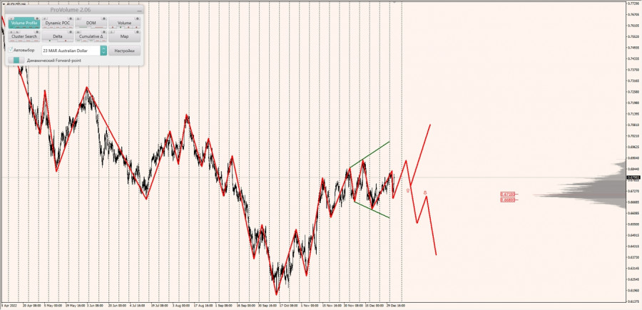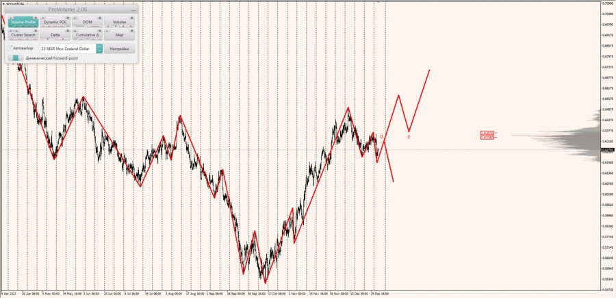 Долгосрочная тенденция: в шорт. Максимальное скопление объемов текущего контракта расположено в диапазоне по котировкам 0.63380-0.63650. В настоящий момент по паре совершаются инвестиционные операции ниже, указывая на силу продавцов.