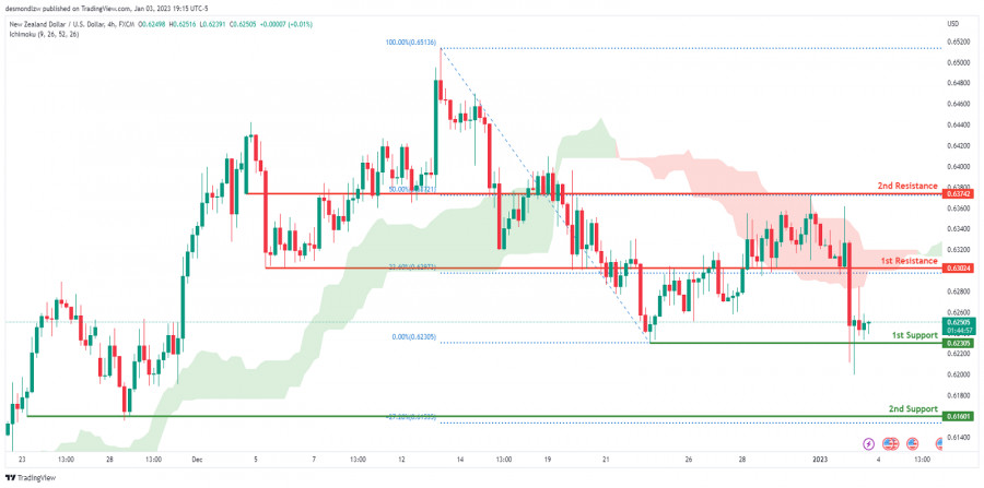 NZD/USD под давлением медведей - технический анализ на 04.01.2023ИнстаФорекс - Instaforex, 2 года назад На 4-часовом графике валютной пары NZD/USD преобладает медвежий настрой. Цена опустилась ниже облака Ишимоку, что указывает на медвежий рынок. Если падение пары продолжится, цена может пробить первую линию поддержки на отметке 0,62305, где также расположен предыдущий локальный минимум. Затем котировка пойдет дальше в сторону второй линии поддержки на отметке 0,61601, где расположен уровень Фибоначчи 27,2%. При другом сценарии цена может снова двинуться вверх по направлению к первой линии сопротивления на уровне 0,63024. Там же расположен уровень Фибоначчи 23,6%. Торговые рекомендации: Точка входа: 0,63024 Условия для входа: входить в сделку на продажу с отложенным лимитным ордером для повторного тестирования первой линии сопротивления Тейк-профит: 0,61601 Условия для фиксирования прибыли: вторая линия поддержки Стоп-лосс: 0,63742 Условия для выставления стоп-лосса: вторая линия сопротивления и последний локальный максимум Материал предоставлен компанией InstaForex - www.instaforex.com |