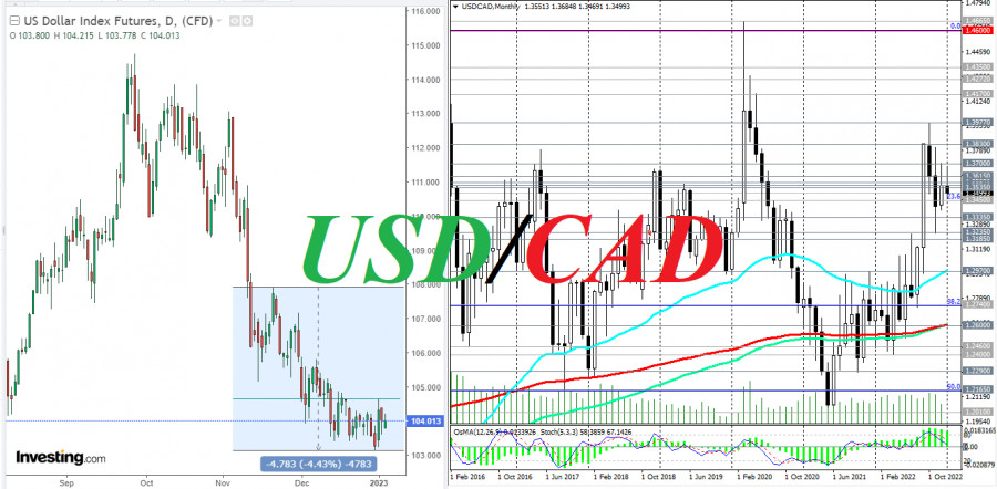 USD/CAD: в ожидании новых драйверовИнстаФорекс - Instaforex, 2 года назад Доллар не смог пока что в значительной мере воспользоваться информацией, полученной из опубликованных вчера протоколов декабрьского заседания ФРС, которые подтвердили готовность ЦБ США к дальнейшему ужесточению денежно-кредитной политики. Как следует из этих протоколов, руководители ФРС считают, что нарушения в глобальной цепочке поставок, а также повышенные инфляционные риски сохранятся ещё как минимум на год, а это с высокой вероятностью означает, что процентная ставка будет вновь повышена на ближайшем заседании (31 января – 1 февраля). Вопрос пока что заключается в том, насколько сильным будет это повышение. Вчера же доллар сильно снизился. Как сообщили в среду в Институте управления поставками (ISM), индекс деловой активности PMI в производственном секторе США в декабре снизился (до 48,4 с 49,0 в ноябре), что оказалось также немного хуже ожиданий. Индекс ISM новых заказов в производственном секторе также снизился в декабре (с 47,2 до 45,2), сильнее ожиданий о росте до 48,1. Опубликованный в это же время (в 15:00 GMT) отчёт JOLTS указал на снижение числа открытых вакансий на рынке труда США до 10,458 млн с 10,512 млн в октябре, оказав на доллар дополнительное давление. *) подробнее о динамике доллара также см. в наших вчерашних обзорах Доллар: ближайшая перспектива и Индекс доллара #USDX: технический анализ и торговые рекомендации на 04/01/2023. На момент же публикации данной статьи фьючерсы на индекс доллара DXY торгуются в узком диапазоне, вблизи отметки 104.01 и цены закрытия вчерашнего торгового дня, в то время как участники рынка, следящие за котировками доллара, ждут новой порции макро экономической статистики из США. Сегодня она будет опубликована в 13:15 и 13:30 (GMT), а также в 14:45, когда S&P Global опубликует отчет по деловой активности в экономике США (подробнее см. в Важнейшие экономические события недели 02.01.2023 – 08.01.2023). В центре внимания будет находиться отчет ADP (Automatic Data Processing) по занятости в частном секторе США за декабрь. Данный отчет предваряет официальный отчет Минтруда США, который выйдет в пятницу, и, обычно, оказывает сильное влияние на рынок и котировки доллара, хотя, прямой корреляции с Non-Farm Payrolls не отмечается. Состояние рынка труда (вместе с данными по ВВП и уровню инфляции) является ключевым индикатором для ФРС при определении параметров ее кредитно-денежной политики. Сильные данные положительно повлияют на доллар; снижение показателя может негативно повлиять на него. В любом случае во время публикации данного отчета может наблюдаться рост волатильности на рынке, и прежде всего в котировках доллара. Предыдущие значения: 127 000 в ноябре, 239 000 в октябре, 192 000 в сентябре, 185 000 в августе, 270 000 в июле, 358 000 в мае, 457 000 в апреле, 425 000 в марте, 375 000 в феврале, 372 000 в январе 2022 года. Прогноз на декабрь: +150 000 новых рабочих мест. Показатель, надо сказать, не очень сильный, но он указывает на возобновление роста после более слабого значения месяцем ранее. В 13:30 Минтруда США опубликует еженедельный отчет с данными по числу первичных и вторичных заявок на пособия по безработице. Здесь ожидается стабилизация показателей, что, вероятно, окажет нейтральное значение на доллар (предыдущие недельные значения по данным на первичные заявки на пособия по безработице 225 тыс., 216 тыс., 214 тыс., 231 тыс., 226 тыс., а предыдущие значения 